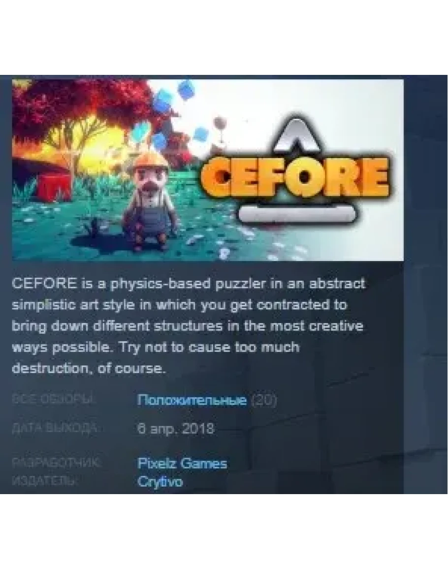 Did you ever want to be an expert at blowing stuff up? Cefore is a physics-based puzzler with a whimsical and simplistic art-style. In Cefore, you play as Baro and are contracted to demolish structures in the most creative ways possible. As the structures get bigger and more complex, your methods of demolition must get more creative.