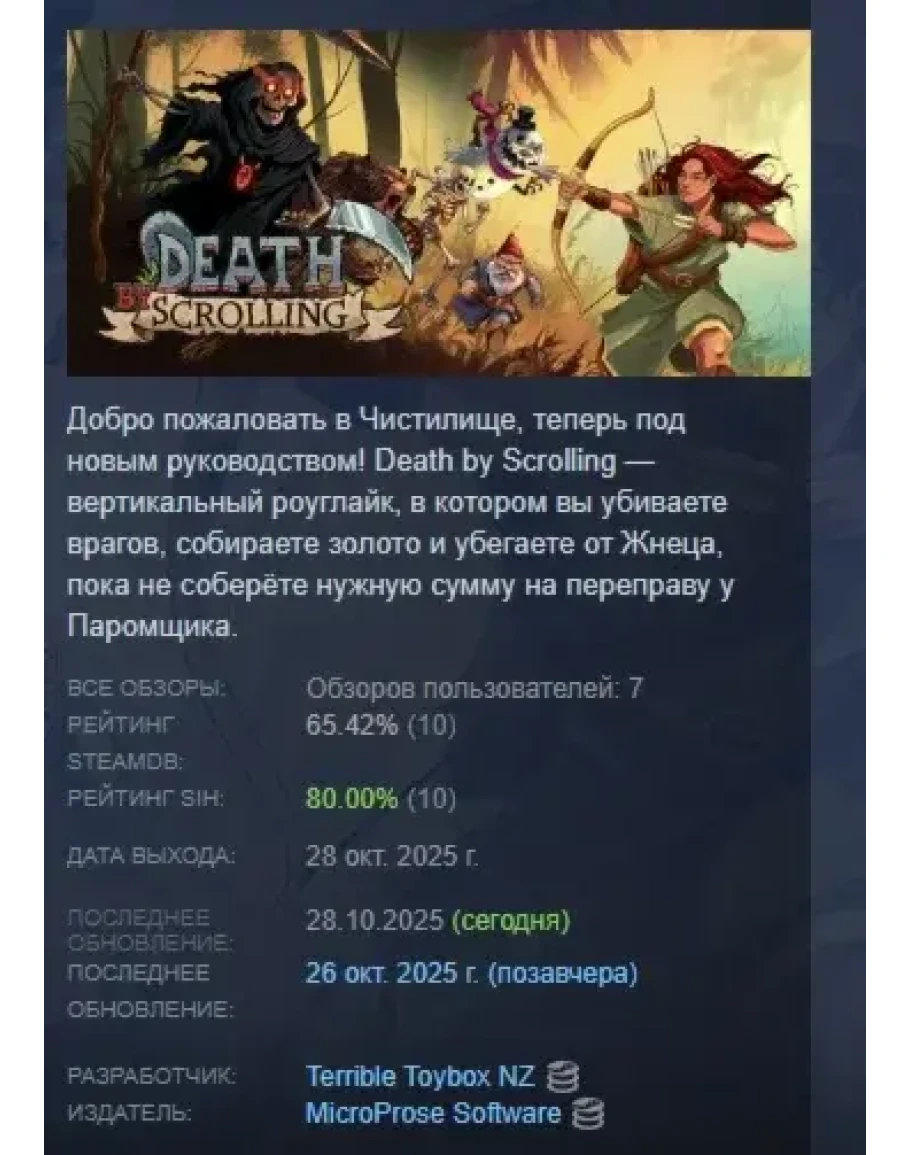 Добро пожаловать в Чистилище, теперь под новым руководством! Death by Scrolling — вертикальный роуглайк, в котором вы убиваете врагов, собираете золото и убегаете от Жнеца, пока не соберёте нужную сумму на переправу у Паромщика.