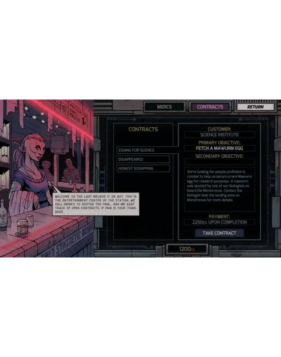 На базе можно залатать раны и повысить уровень мастерства наемников, улучшить снаряжение, набрать и вооружить новых бойцов, а также восполнить запас энергии, необходимой для поддержания систем жизнеобеспечения на задании.