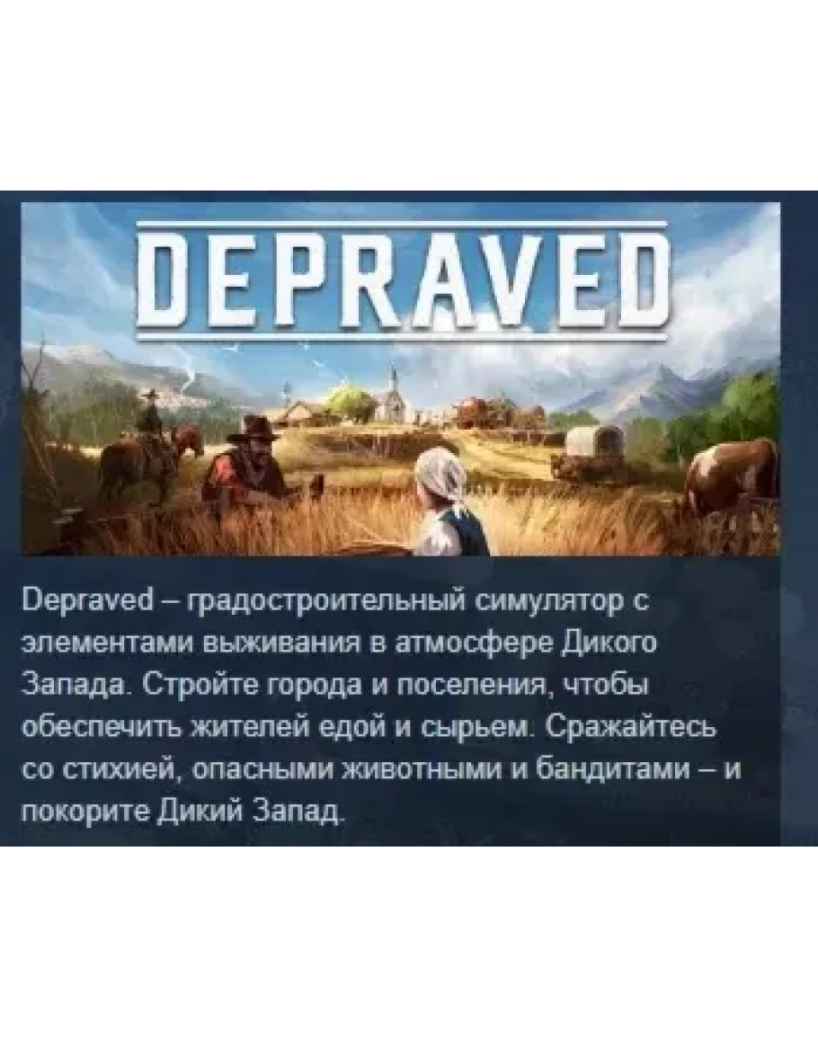 В Depraved вы поведете первопроходцев на Дикий Запад. Ваше приключение в этом процедурно генерированном мире начнется всего лишь с одной повозкой с ресурсами. Выберите подходящее место для первого поселения и раздобудьте материалы: возьмите их у матушки-природы или начните торговлю. Создайте новую страну для переселенцев. Чем они счастливее, тем быстрее растет ваш город.