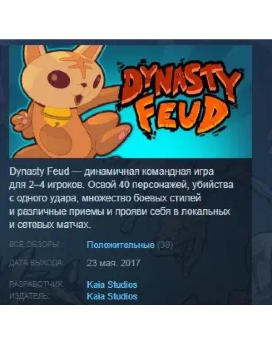 Dynasty Feud — динамичная командная игра для 2–4 игроков. Освой 40 персонажей, убийства с одного удара, множество боевых стилей и различные приемы и прояви себя в локальных и сетевых матчах.