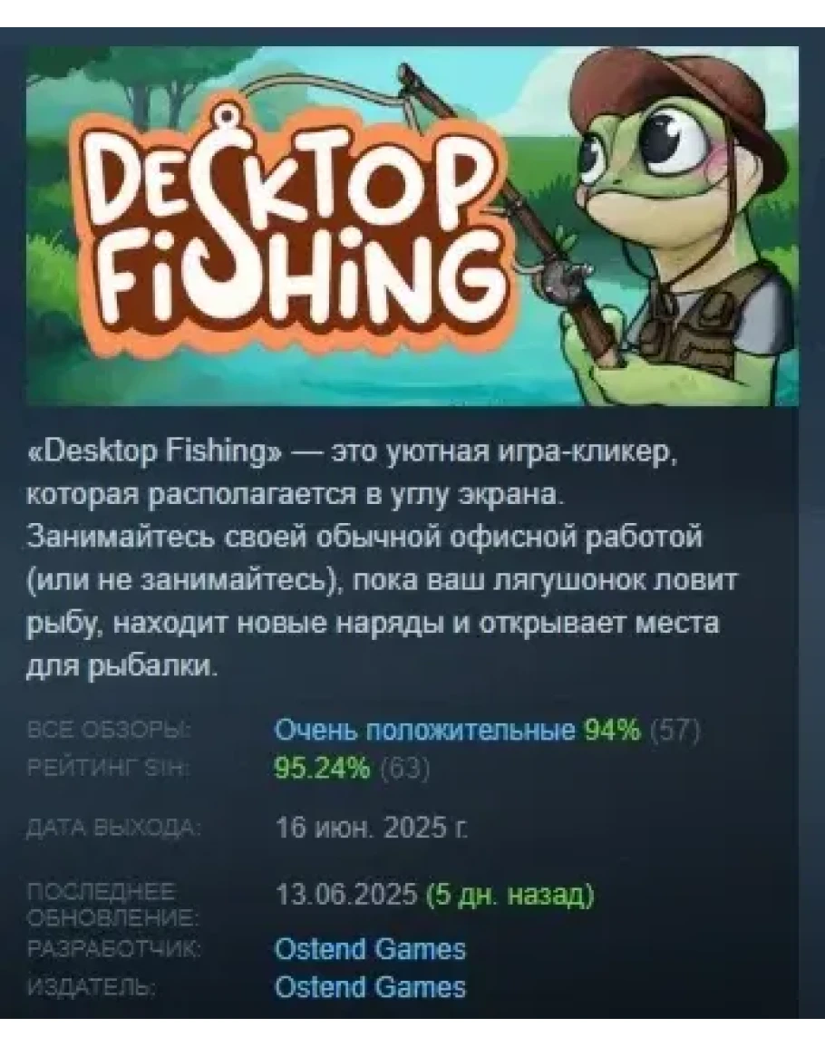 «Desktop Fishing» — это уютная игра-кликер, которая располагается в углу экрана. Занимайтесь своей обычной офисной работой (или не занимайтесь), пока ваш лягушонок ловит рыбу, находит новые наряды и открывает места для рыбалки.