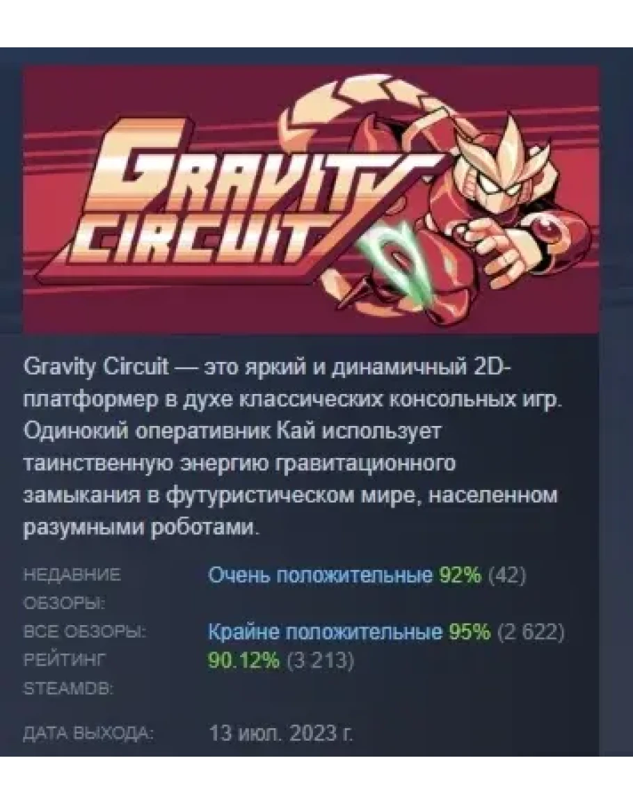 Gravity Circuit — это яркий и динамичный 2D-платформер в духе классических консольных игр. Одинокий оперативник Кай использует таинственную энергию гравитационного замыкания в футуристическом мире, населенном разумными роботами.