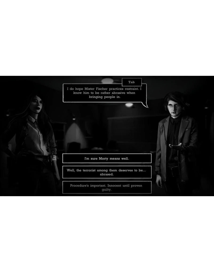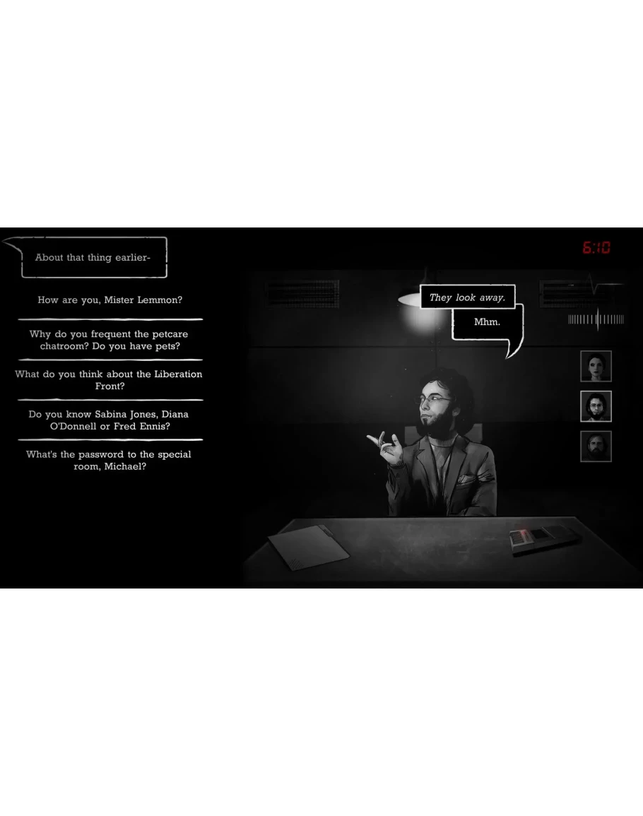 Вы — офицер полиции, противостоящий опасной террористической группе. Проводите допросы, управляйте командой и ее репутацией — и помните о времени. На что вы пойдете, чтобы остановить преступников? Манипуляции, угрозы, пытки? Оправдывает ли цель средства?