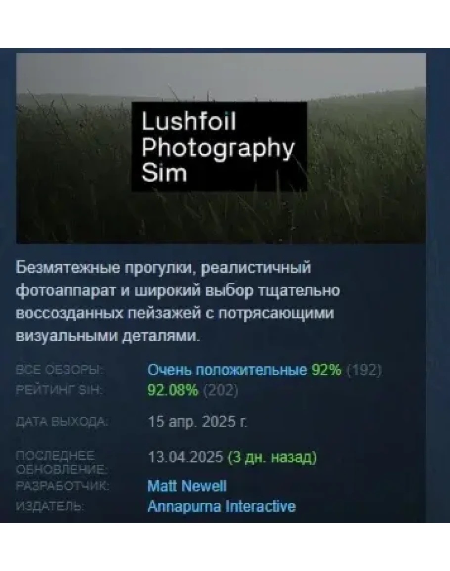 Lushfoil Photography Sim АВТОДОСТАВКА STEAM РОССИЯ
