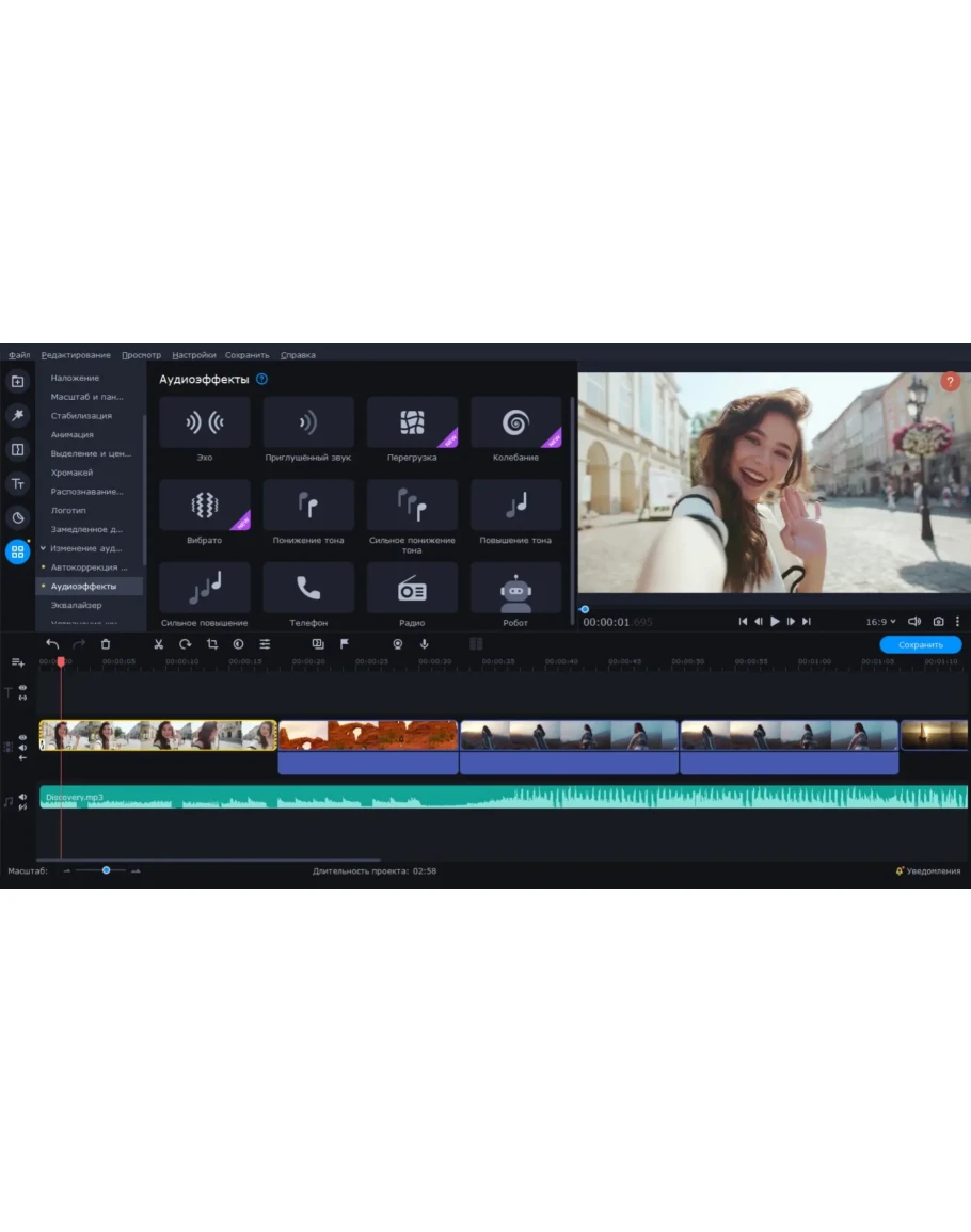 Монтаж с Movavi Video Editor Plus – это интересно, быстро и просто. Создавайте тематические клипы, работайте со звуком и добавляйте спецэффекты даже без опыта видеоредактирования, загружайте ролик прямо на YouTube – и все это за 20 минут. Воплощайте творческие идеи с легкостью!