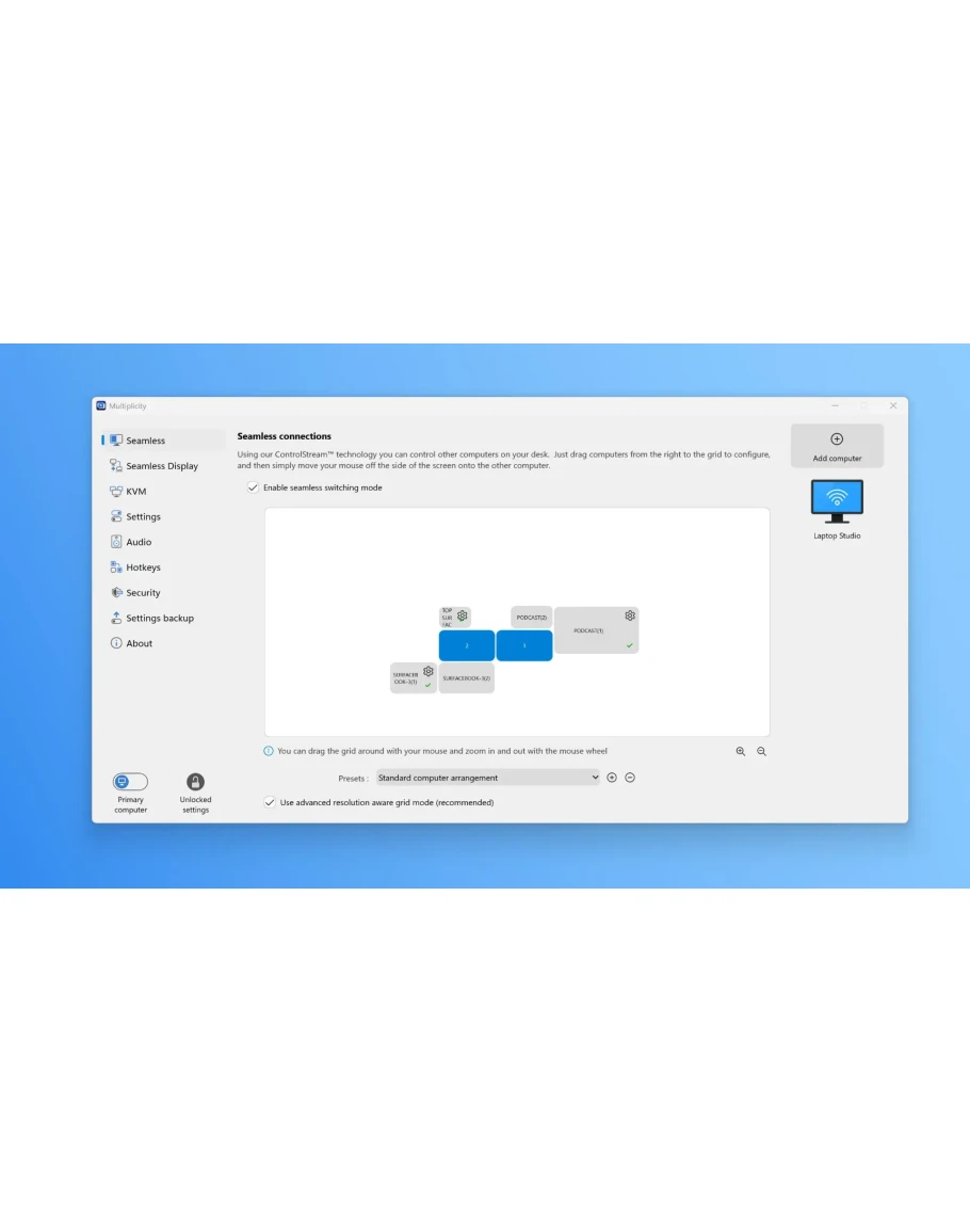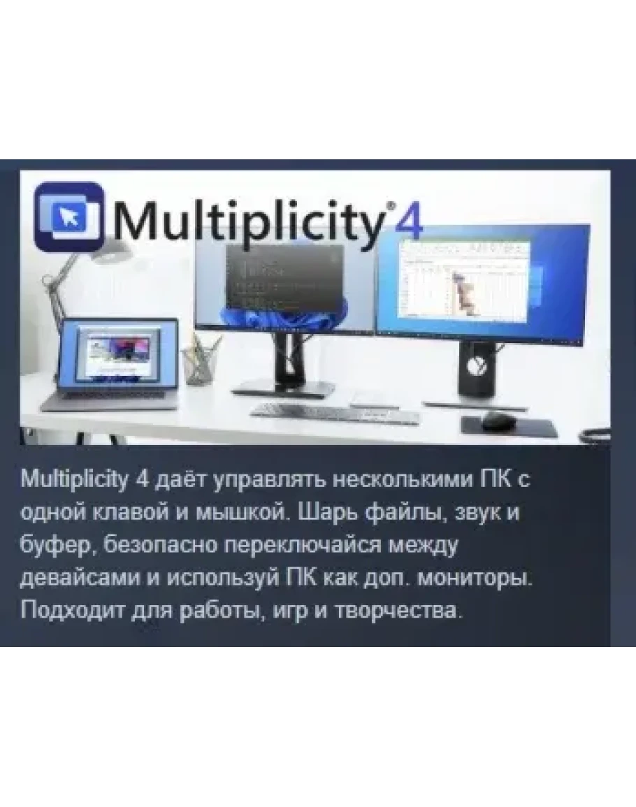 Multiplicity 4 даёт управлять несколькими ПК с одной клавой и мышкой. Шарь файлы, звук и буфер, безопасно переключайся между девайсами и используй ПК как доп. мониторы. Подходит для работы, игр и творчества.