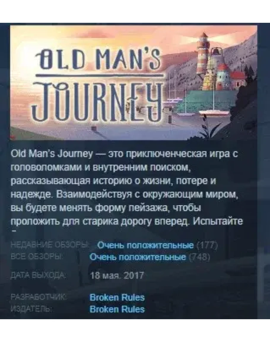 В ходе этого ненавязчивого игрового процесса вы попадете в живой и радостный мир и взглянете на хитросплетения жизни глазами старого человека. Созерцательная, восхитительная и задумчивая, Old Man’s Journey приглашает вас погрузиться в тихую и любознательную атмосферу решения головоломок и испытать боль, сожаление и надежду старого человека.