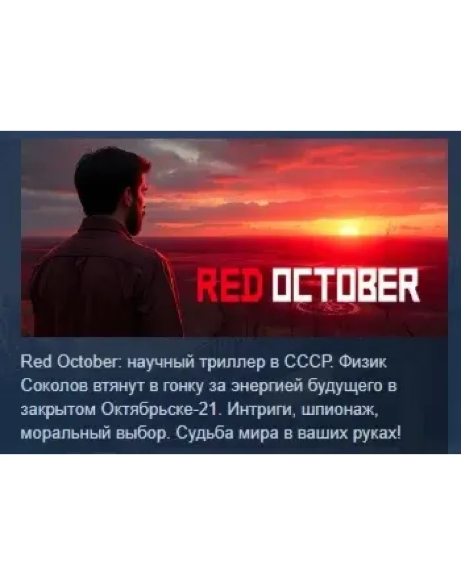 "Red October" перенесет вас в засекреченный научный центр Октябрьск-21, где кипит работа над проектом "Красный Октябрь" – революционным источником энергии, основанным на холодном ядерном синтезе. Вам предстоит примерить на себя роль молодого физика-ядерщика Дмитрия Соколова, который только что прибыл в город и сразу же оказывается в эпицентре событий, способных изменить мир.