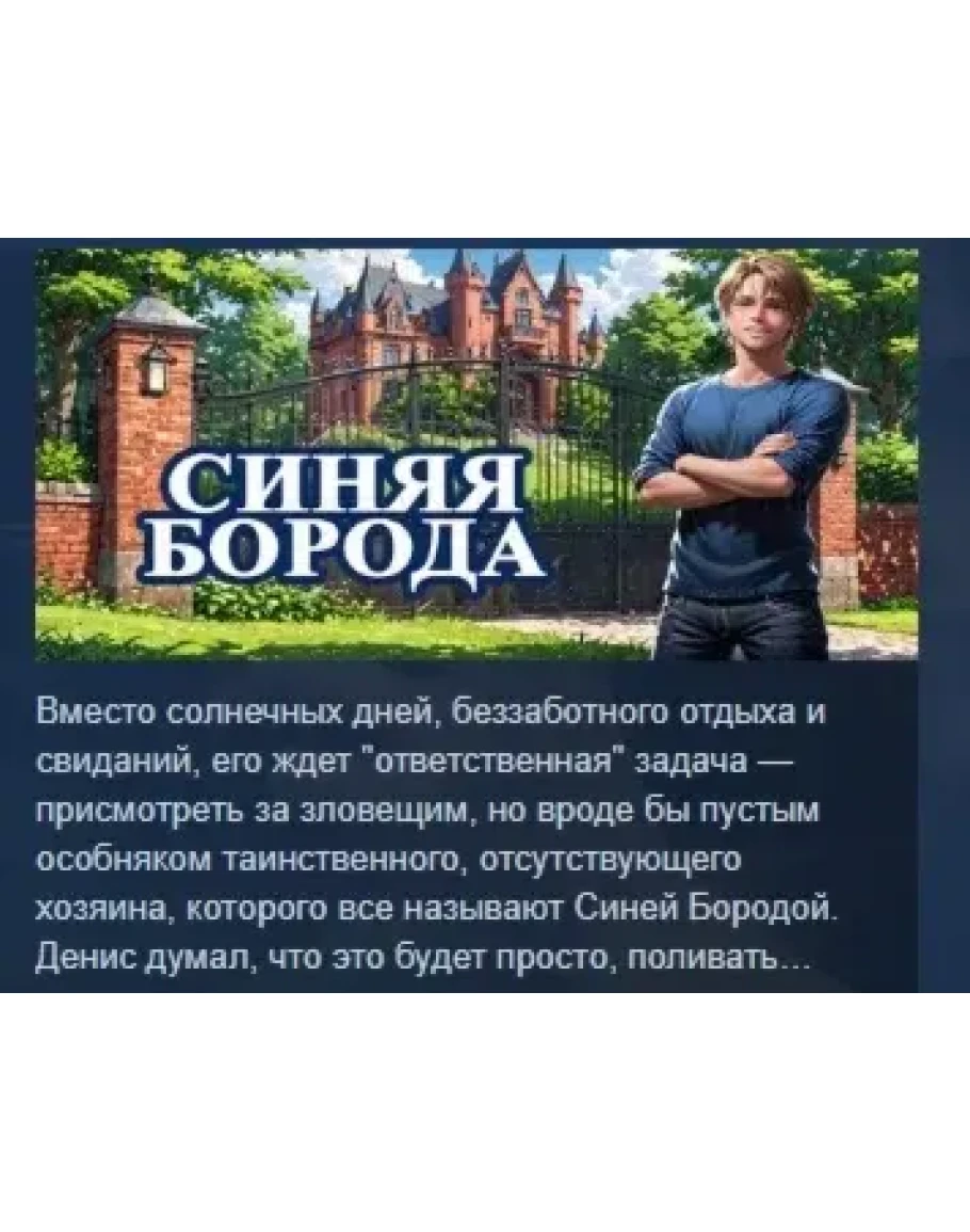 Познакомьтесь с Денисом, обычным подростком, чьи летние каникулы пошли наперекосяк. Вместо солнечных дней, беззаботного отдыха и свиданий, его ждет "ответственная" задача — присмотреть за зловещим, но вроде бы пустым особняком таинственного, отсутствующего хозяина, которого все называют Синей Бородой. Денис думал, что это будет просто протирать пыль, поливать цветочки и скучать в тишине...
