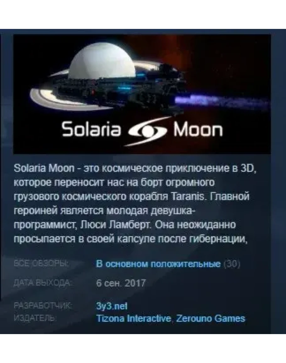 Solaria Moon - это космическое приключение в 3D, которое переносит нас на борт огромного грузового космического корабля Taranis. Главной героиней является молодая девушка-программист, Люси Ламберт. Она неожиданно просыпается в своей капсуле после гибернации, находясь в растерянном состоянии и не понимая, что же случилось на борту. С этого момента начинается приключение полное секретов и загадок, ждущих решения.