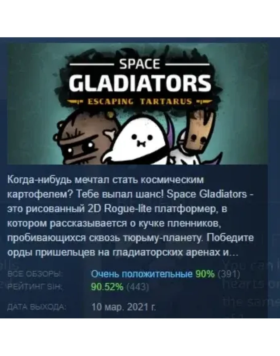 Когда-нибудь мечтал стать космическим картофелем? Тебе выпал шанс! Space Gladiators - это рисованный 2D Rogue-lite платформер, в котором рассказывается о кучке пленников, пробивающихся сквозь тюрьму-планету. Победите орды пришельцев на гладиаторских аренах и заслужите свободу!