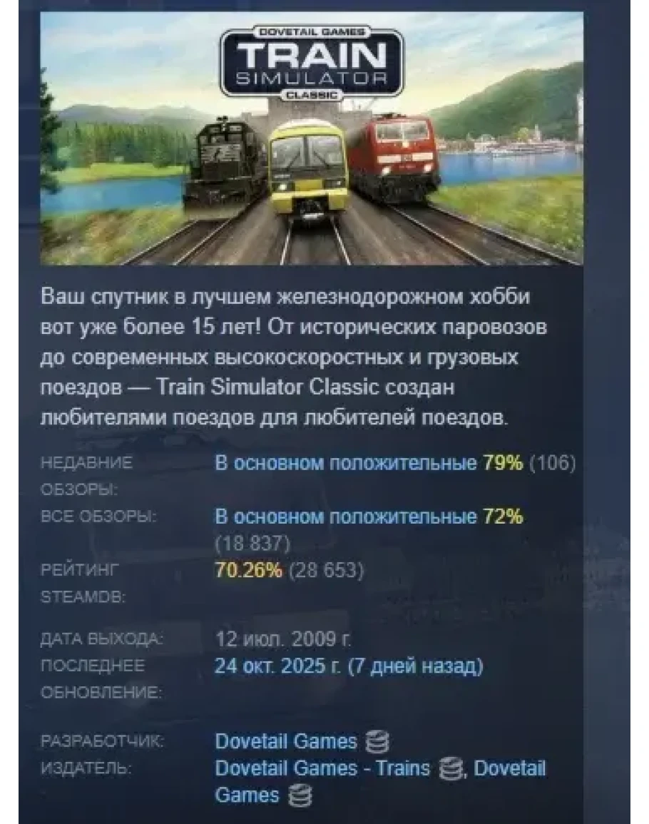 Ваш спутник в лучшем железнодорожном хобби вот уже более 15 лет! От исторических паровозов до современных высокоскоростных и грузовых поездов — Train Simulator Classic создан любителями поездов для любителей поездов.