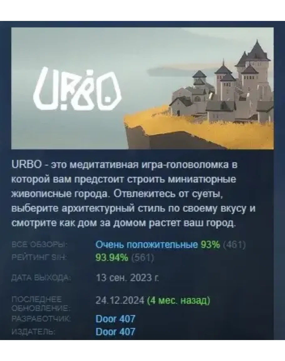 URBO - это медитативная игра-головоломка в которой вам предстоит строить миниатюрные живописные города. Отвлекитесь от суеты, выберите архитектурный стиль по своему вкусу и смотрите как дом за домом растет ваш город.