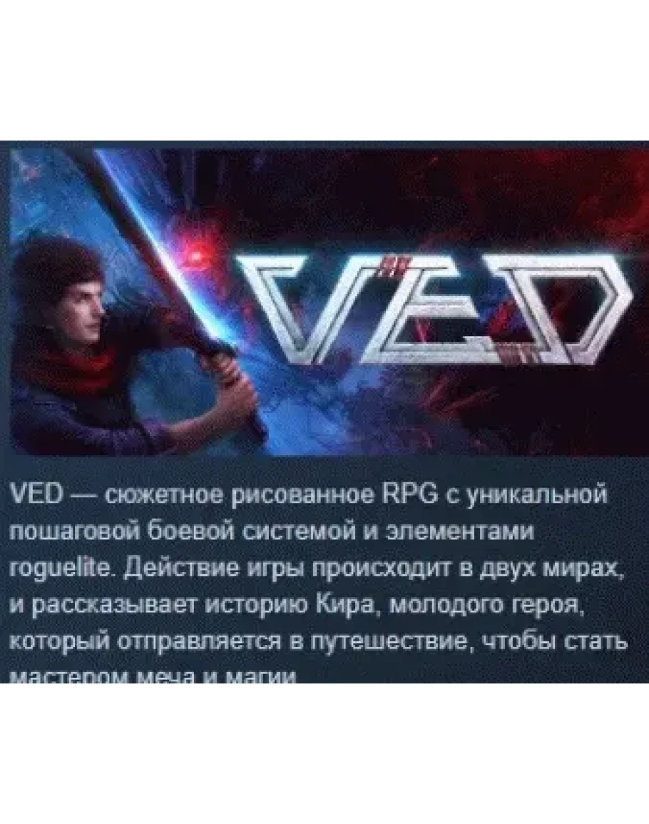 VED — сюжетное рисованное RPG с уникальной пошаговой боевой системой и элементами roguelite. Действие игры происходит в двух мирах, и рассказывает историю Кира, молодого героя, который отправляется в путешествие, чтобы стать мастером меча и магии.