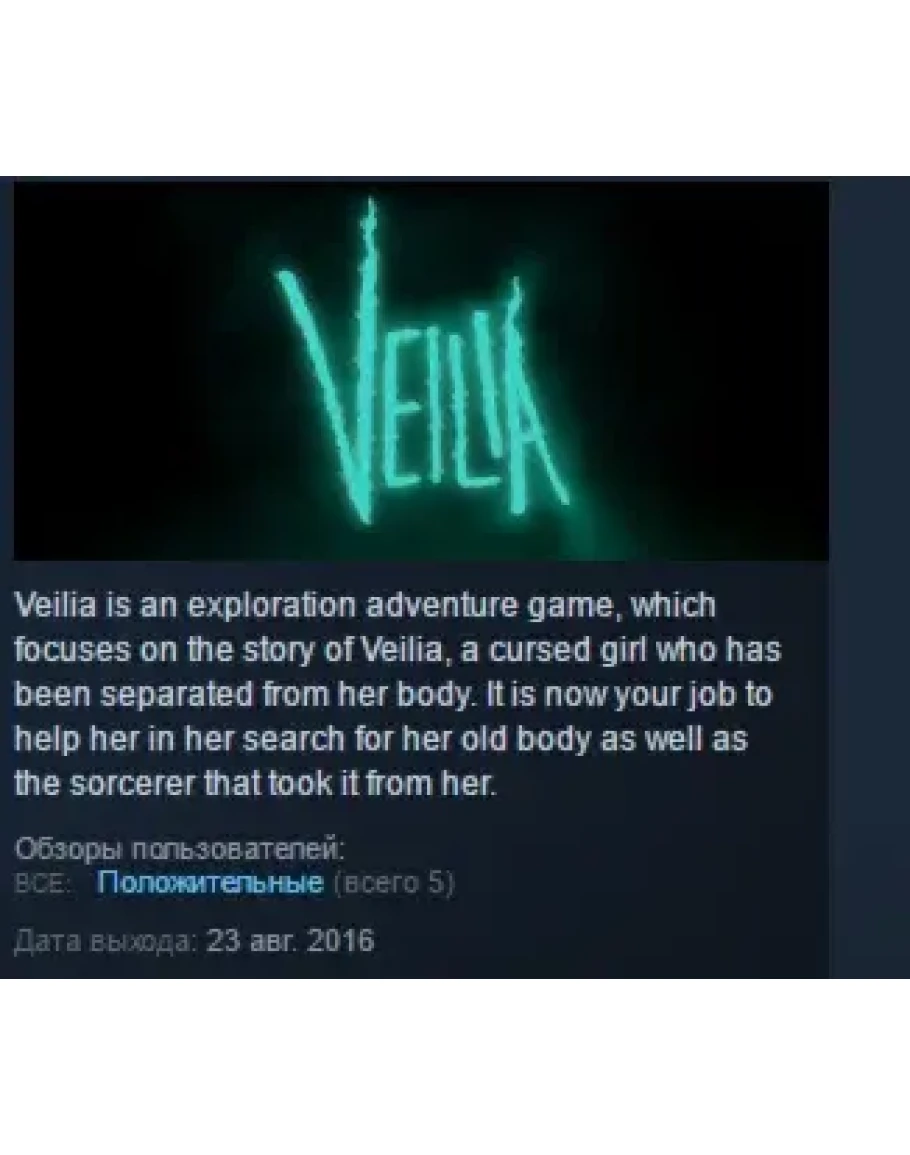 Veilia is an exploration adventure game, which focuses on the story of Veilia, a cursed girl who has been separated from her body. It is now your job to help her in her search for her old body as well as the sorcerer that took it from her.