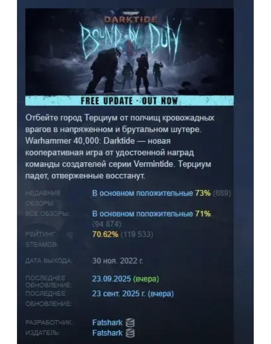Отбейте город Терциум от полчищ кровожадных врагов в напряженном и брутальном шутере. Warhammer 40,000: Darktide — новая кооперативная игра от удостоенной наград команды создателей серии Vermintide. Терциум падет, отверженные восстанут.