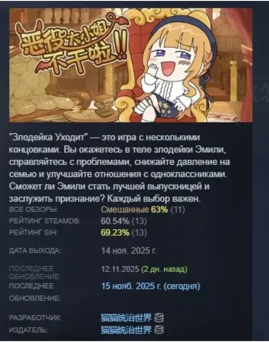 "Злодейка Уходит" — это игра с несколькими концовками. Вы окажетесь в теле злодейки Эмили, справляйтесь с проблемами, снижайте давление на семью и улучшайте отношения с одноклассниками. Сможет ли Эмили стать лучшей выпускницей и заслужить признание? Каждый выбор важен.