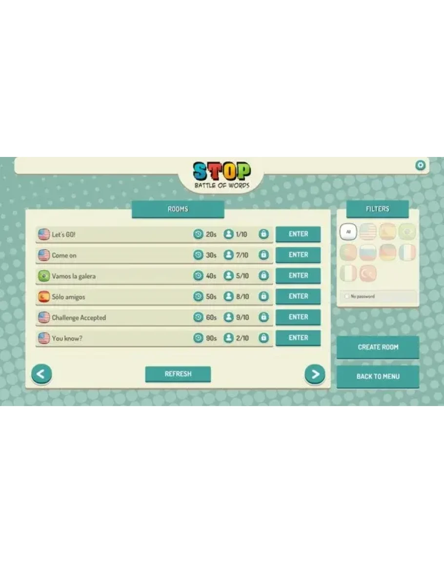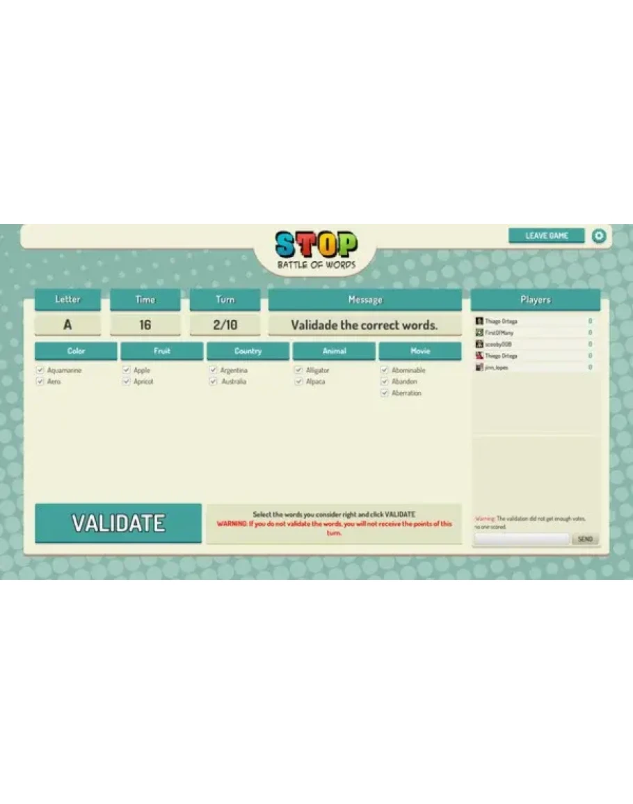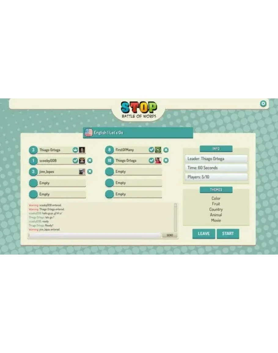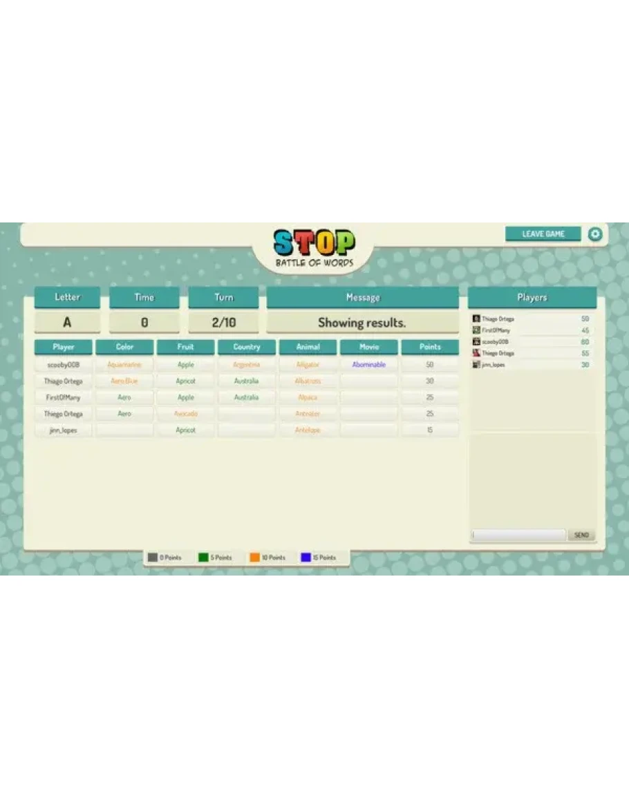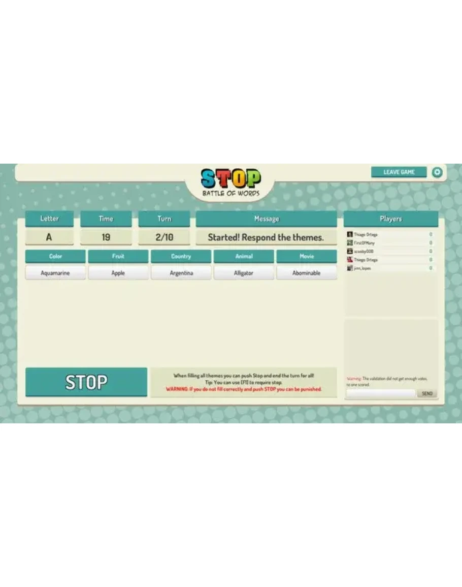 ★ Кнопка остановки: После заполнения минимально требуемого количества тем правильными словами вы можете остановить игру, тем самым остановив раунд для всех игроков.