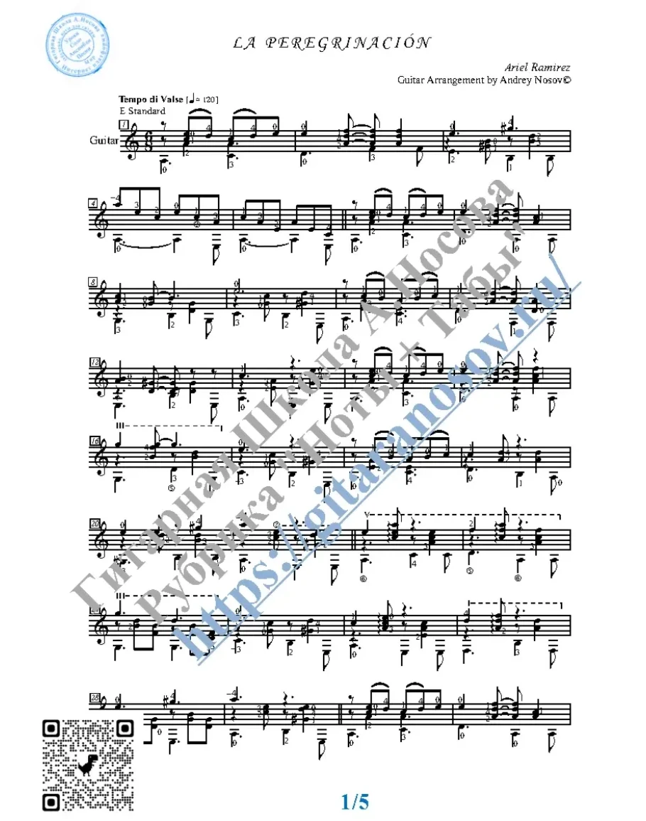 Кликните "Подробнее" для получения дополнительной информацииВашему вниманию предлагается композиция "La Peregrinacion (A.Ramirez)", предназначенная для исполнения на 6-ти струнной гитаре СОЛО. Запись выполнена нотами, сопровождена подробнейшей аппликатурой и продублирована табулатурой. И ещё…