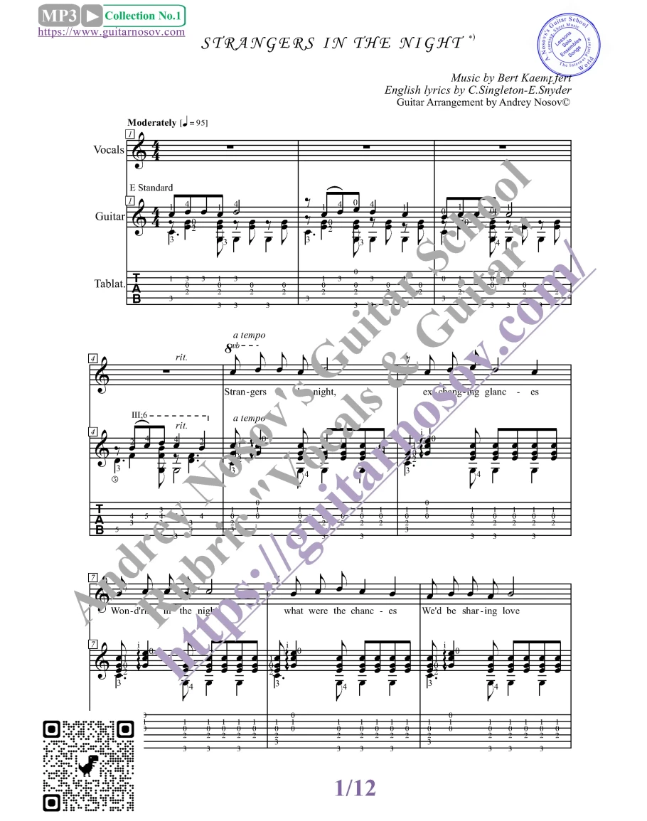 Кликните "Подробнее" для получения дополнительной информацииВашему вниманию предлагается композиция "Strangers in the Night (mus.B.Kaempfert, eng.lyr.C.Singleton-E.Snyder)", предназначенная для вокала в сопровождении 6-ти струнной гитары. Запись выполнена нотами и включает в себя партию вокала с подтекстовкой, партию гитары с подробнейшей аппликатурой и текст песни (НА АНГЛИЙСКОМ). Партия гитары продублирована табулатурой.
