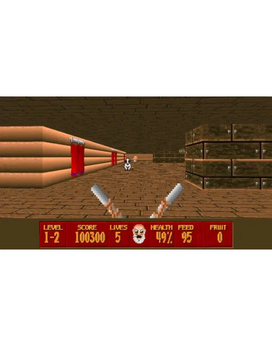 Первое, что вы вспомните, начав играть, - это Wolfenstein 3D. Изначально вообще кажется, что это он и есть, просто с перерисованными текстурами, портретами Ноя и его семьи вместо Гитлера и испившими из копытца солдатами Третьего Рейха. Однако если углубиться в игру, то становится ясно, что из первоисточника взят только движок и интерфейс, всё остальное тут иное.