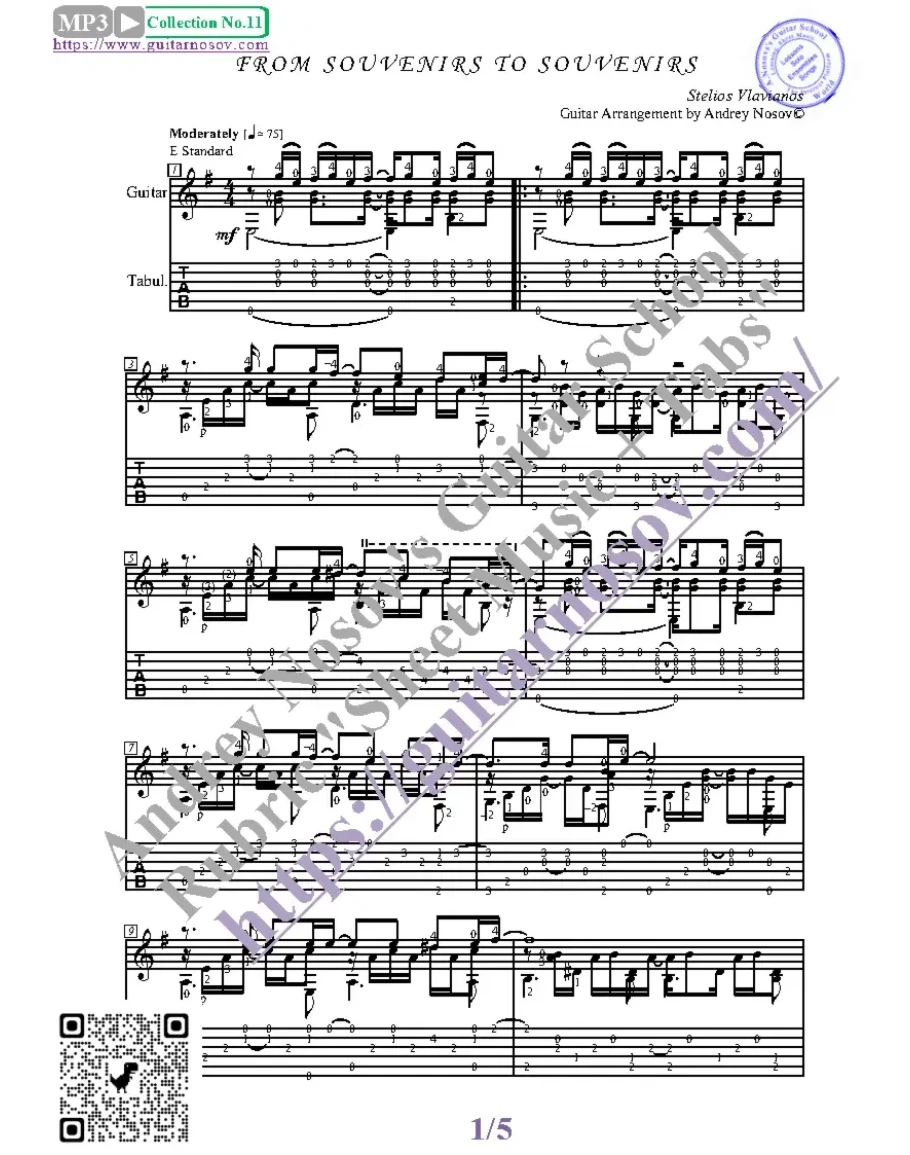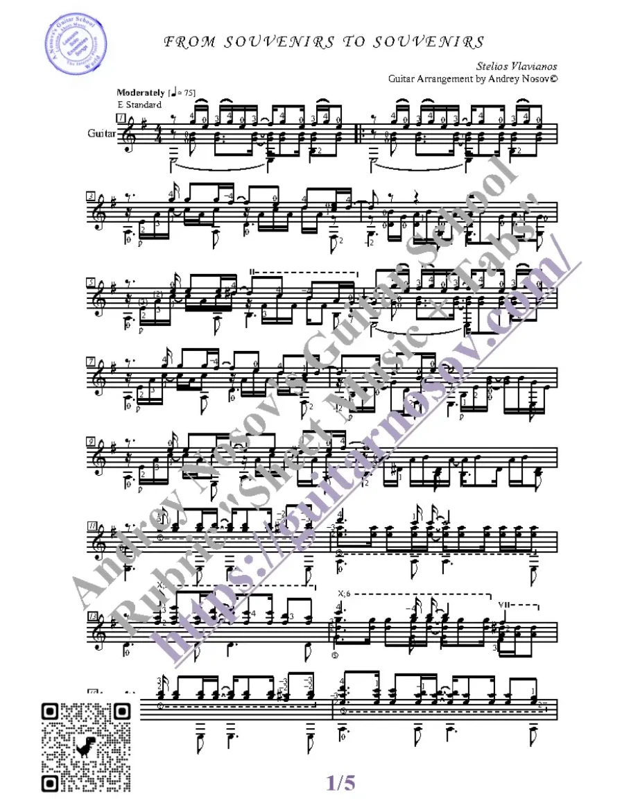 Кликните "Подробнее" для получения дополнительной информацииВашему вниманию предлагается композиция "From Souvenirs to Souvenirs (S.Vlavianos)", предназначенная для исполнения на 6-ти струнной гитаре СОЛО. Запись выполнена нотами, сопровождена подробнейшей аппликатурой и продублирована табулатурой.