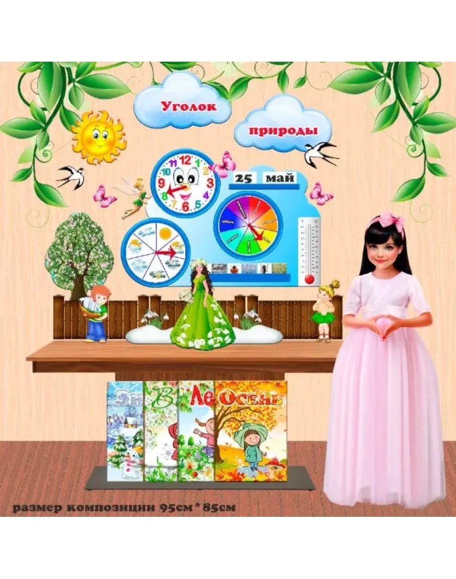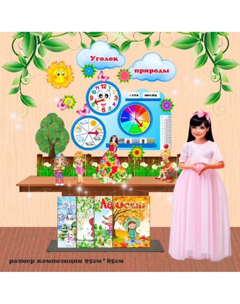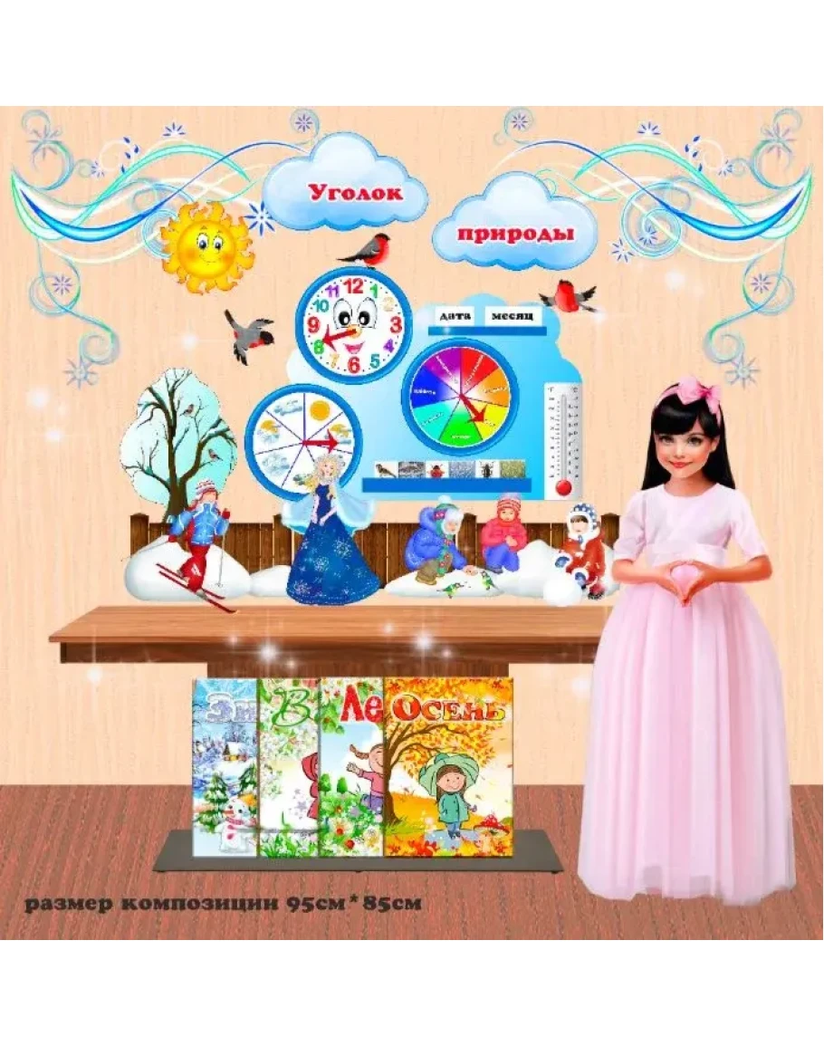 Электронные макеты для распечатки и самостоятельного оформления уголка природы.В комплект входит шапочка облачка(уголок,мир,центр) на выбор,солнышко,календарь наблюдений,заборчик,летние элементы:фея Лето,ребятки,трава,дерево летнее,цветочки,бабочки,осенние элементы:фея осень,ребятки,элементы с фруктами,дерево,листочки,зимние элементы:фея Зима,ребятки,снегири,дерево зимнее,сугробы,весеннее оформление:фея Весна,подснежники,ландыши,ребятки,птички,весеннее дерево