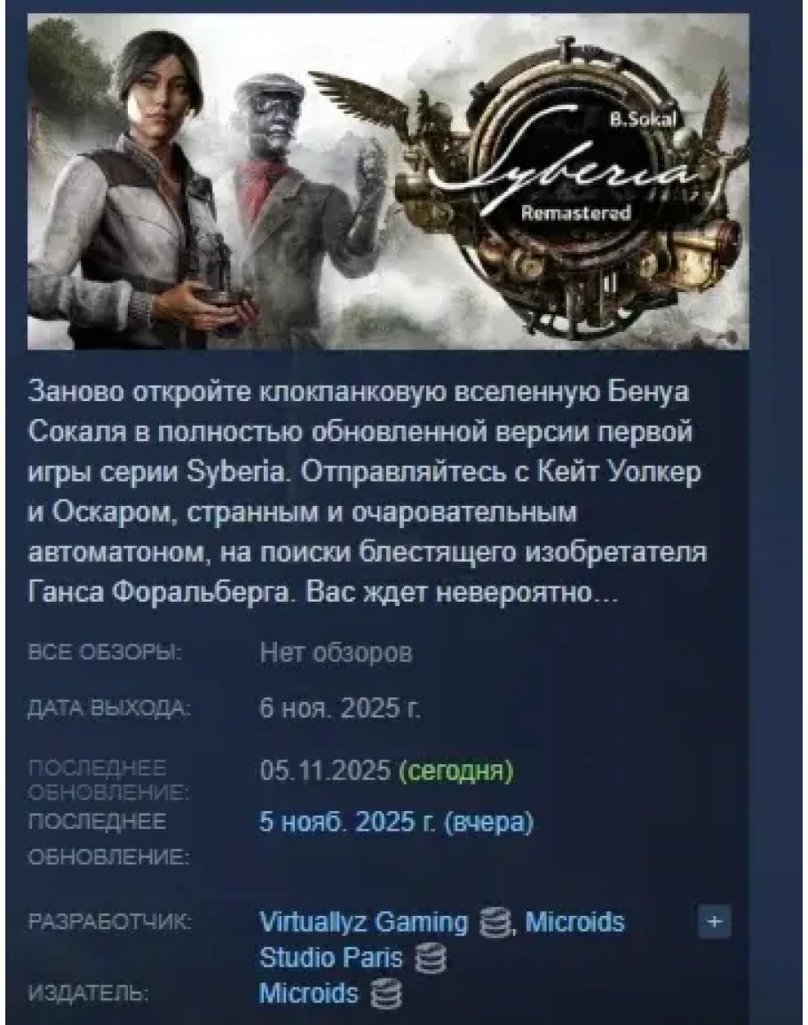 Впервые увидевшая свет в 2002 году Syberia стала образцом приключенческих игр. Ее хвалили за уникальную атмосферу, отличное повествование и насыщенный художественный стиль Бенуа Сокаля. Эта обновленная версия дарит возможность (заново) открыть для себя этот шедевр, прошедший по стопам других работ Бенуа Сокаля — в частности, Syberia: The World Before и недавно вышедшей Amerzone: The Explorer’s Legacy.