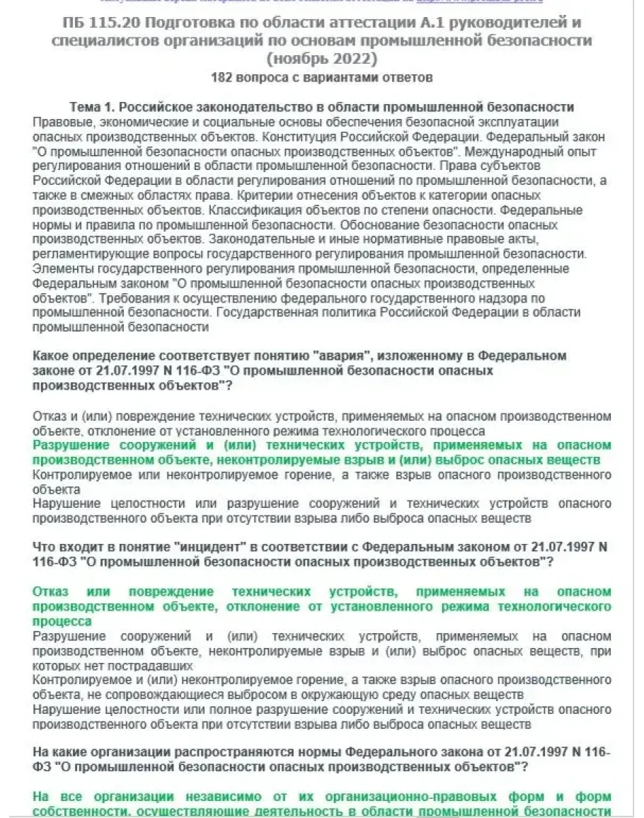 Вопросы с ответами к курсам ОКС-Олимп A.1 ПБ 115.20 (ноябрь 2022) Подготовка и аттестация руководителей и специалистов организаций по основам промышленной безопасности