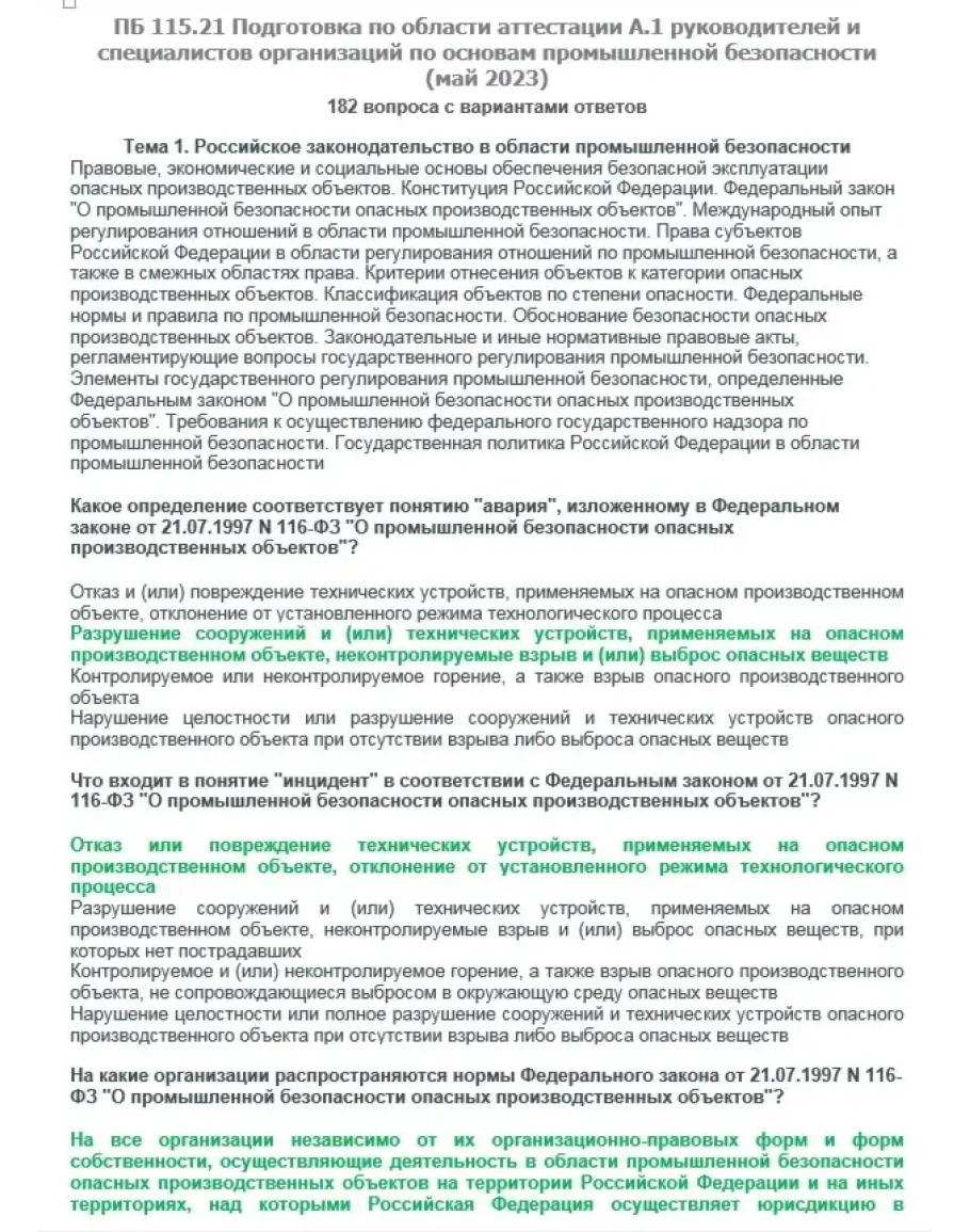 Вопросы с ответами к курсам ОКС-Олимп A.1 ПБ 115.21 (май 2023) Подготовка и аттестация руководителей и специалистов организаций по основам промышленной безопасности