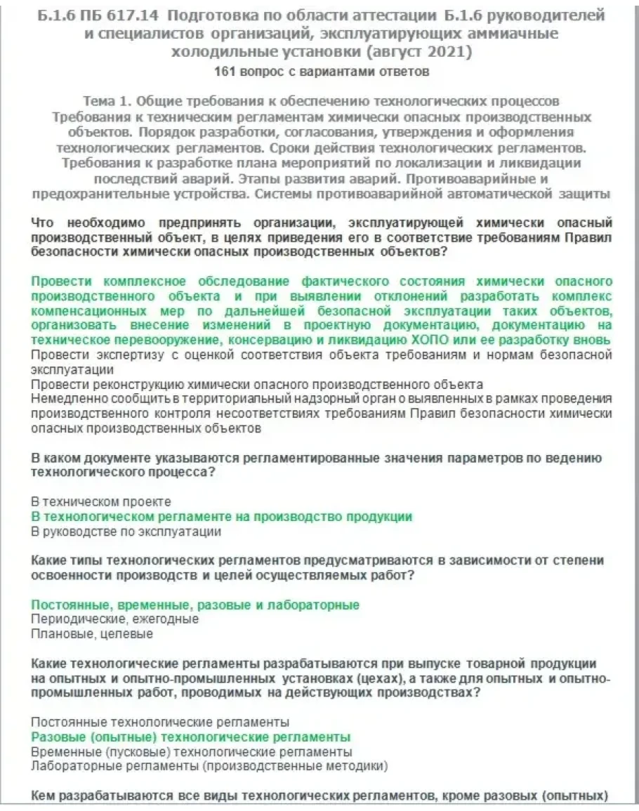 Вопросы с ответами к курсам ОКС-Олимп Б.1.6 ПБ 617.14 (август 2021) Подготовка по области аттестации Б.1.6 руководителей и специалистов организаций, эксплуатирующих аммиачные холодильные установки
