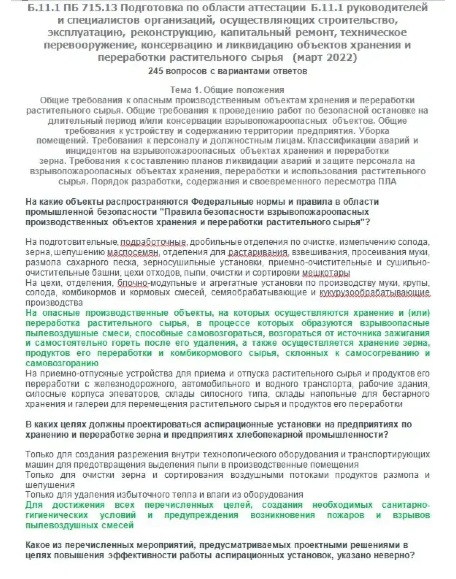 Вопросы с ответами к курсам ОКС-Олимп Б.1.11 ПБ 715.13 (март 2022) Подготовка по области аттестации Б.11.1 руководителей и специалистов организаций, осуществляющих строительство, эксплуатацию, реконструкцию, капитальный ремонт, техническое перевооружение, консервацию и ликвидацию объектов хранения и переработки растительного сырья