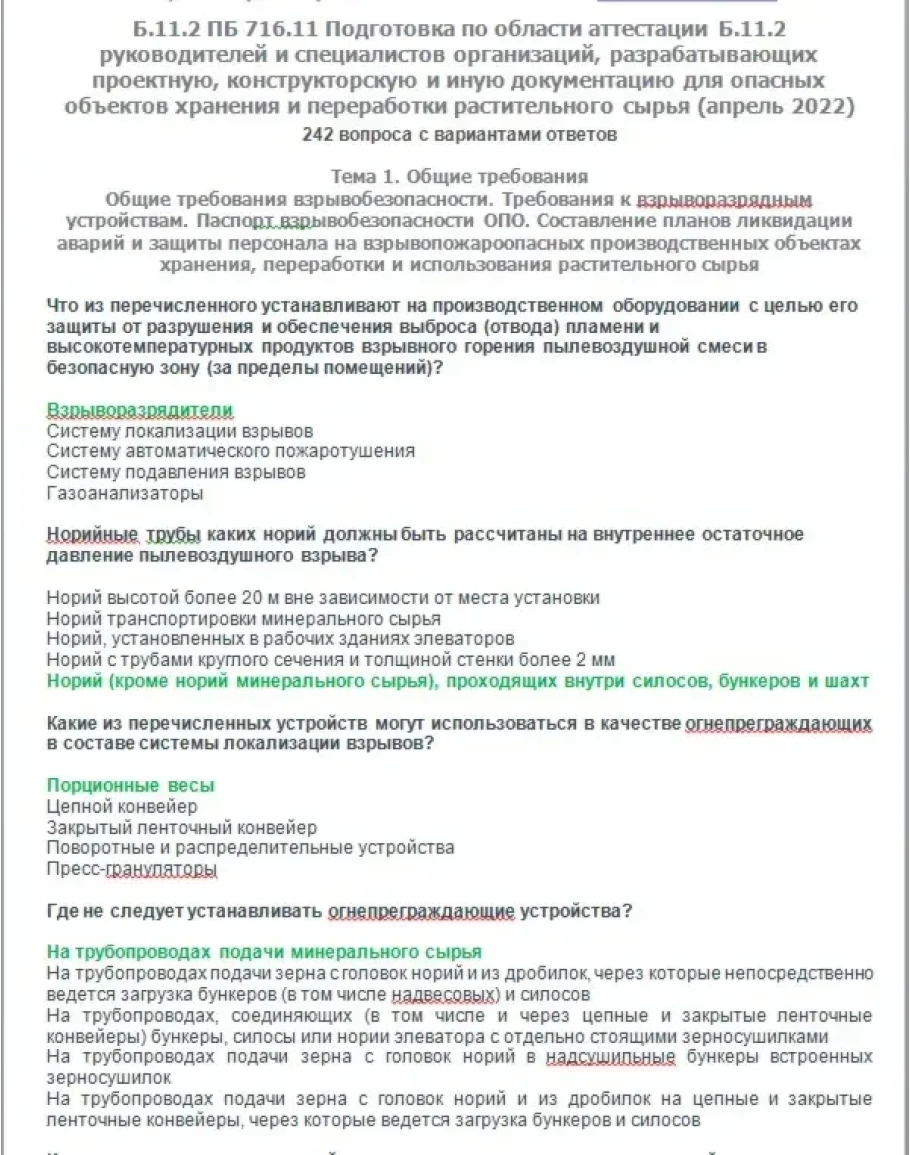 Вопросы с ответами к курсам ОКС-Олимп Б.11.2 ПБ 716.11 (апрель 2022) Подготовка по области аттестации Б.11.2 руководителей и специалистов организаций, разрабатывающих проектную, конструкторскую и иную документацию для опасных объектов хранения и переработки растительного сырья
