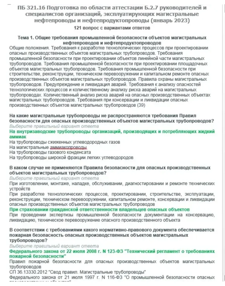 Вопросы с ответами к курсам ОКС-Олимп Б.2.7 ПБ 321.16 (январь 2023) Подготовка и аттестация руководителей и специалистов организаций, эксплуатирующих магистральные нефтепроводы и нефтепродуктопроводы