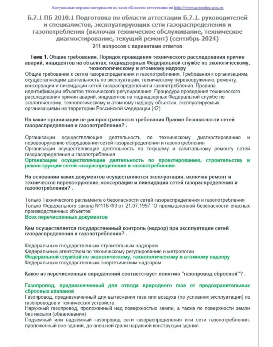 Вопросы с ответами к курсам ОКС-Олимп Б.7.1 ПБ 2010.1 (сентябрь 2024) Подготовка по области аттестации Б.7.1 руководителей и специалистов, эксплуатирующих сети газораспределения и газопотребления