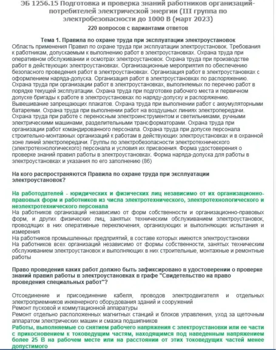 Вопросы с ответами к курсам ОКС-Олимп ЭБ 1256.15 (март 2023) Подготовка и проверка знаний работников организаций-потребителей электрической энергии (III группа до 1000В)