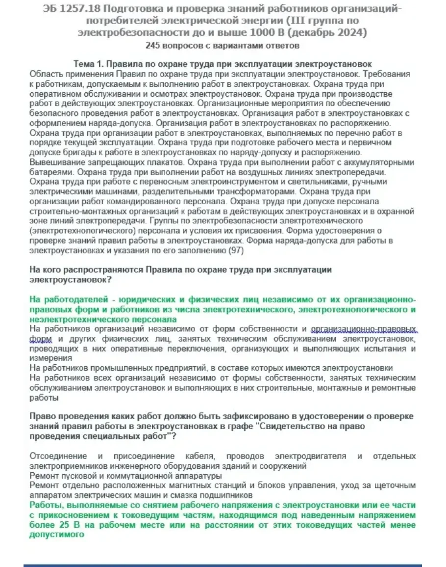 Вопросы с ответами к курсам ОКС-Олимп ЭБ 1257.18 (декабрь 2024) Подготовка и проверка знаний работников организаций-потребителей электрической энергии (III группа до и выше 1000В)
