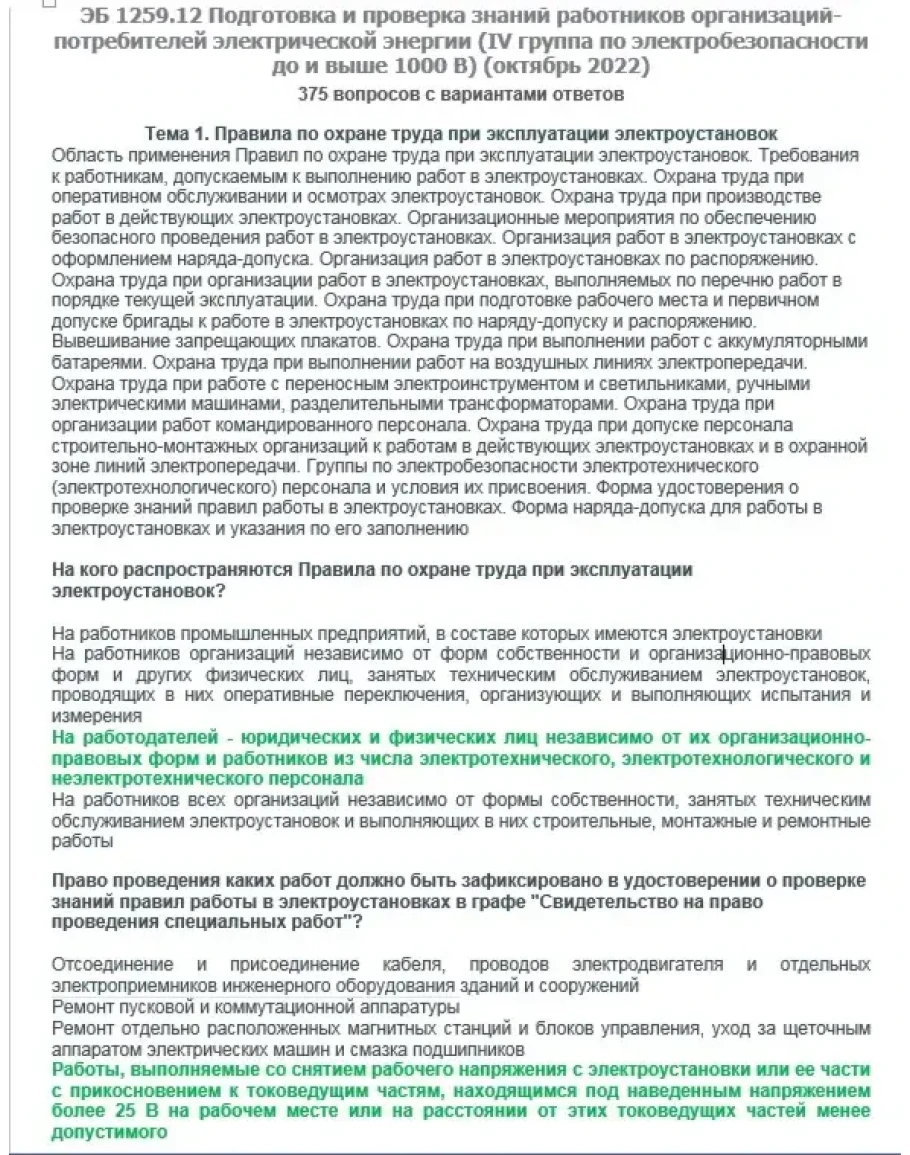 Вопросы с ответами к курсам ОКС-Олимп ЭБ 1259.12 (октябрь 2022) Подготовка и проверка знаний работников организаций-потребителей электрической энергии (IV группа до и выше 1000В)