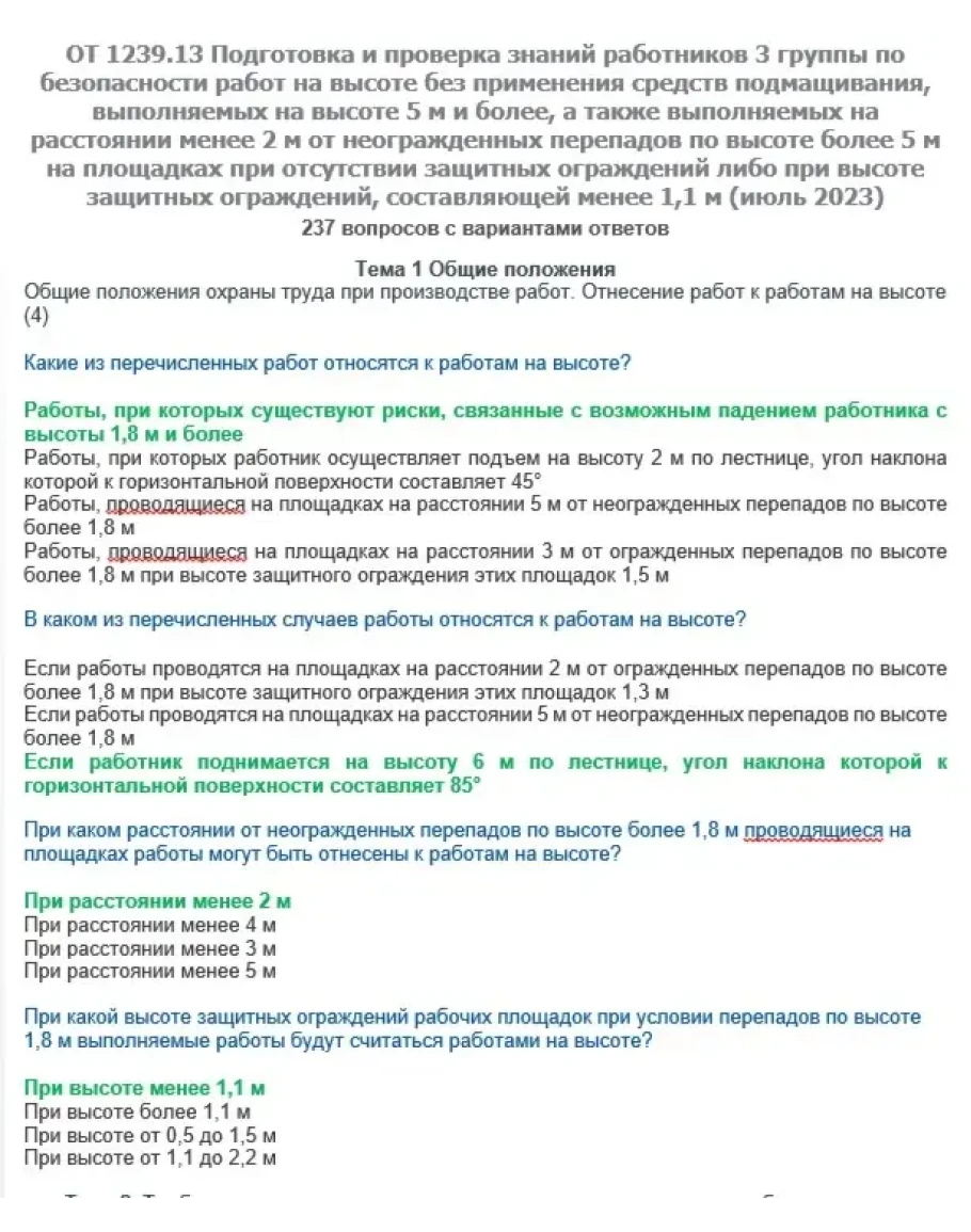 Вопросы с ответами к курсам ОКС-Олимп ОТ 1239.13 (июль 2023) Подготовка и проверка знаний работников 3 группы по безопасности работ на высоте без применения средств подмащивания, выполняемых на высоте 5 м и более, а также выполняемых на расстоянии менее 2 м от неогражденных перепадов по высоте более 5 м на площадках при отсутствии защитных ограждений либо при высоте защитных ограждений, составляющей менее 1,1 м