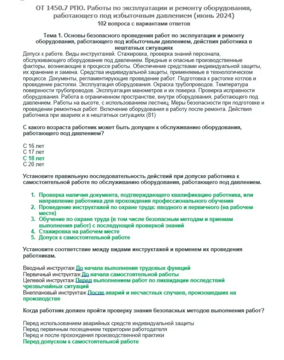 Вопросы с ответами к курсам ОКС-Олимп ОТ 1450.7 (июнь 2024) РПО. Работы по эксплуатации и ремонту оборудования, работающего под избыточным давлением