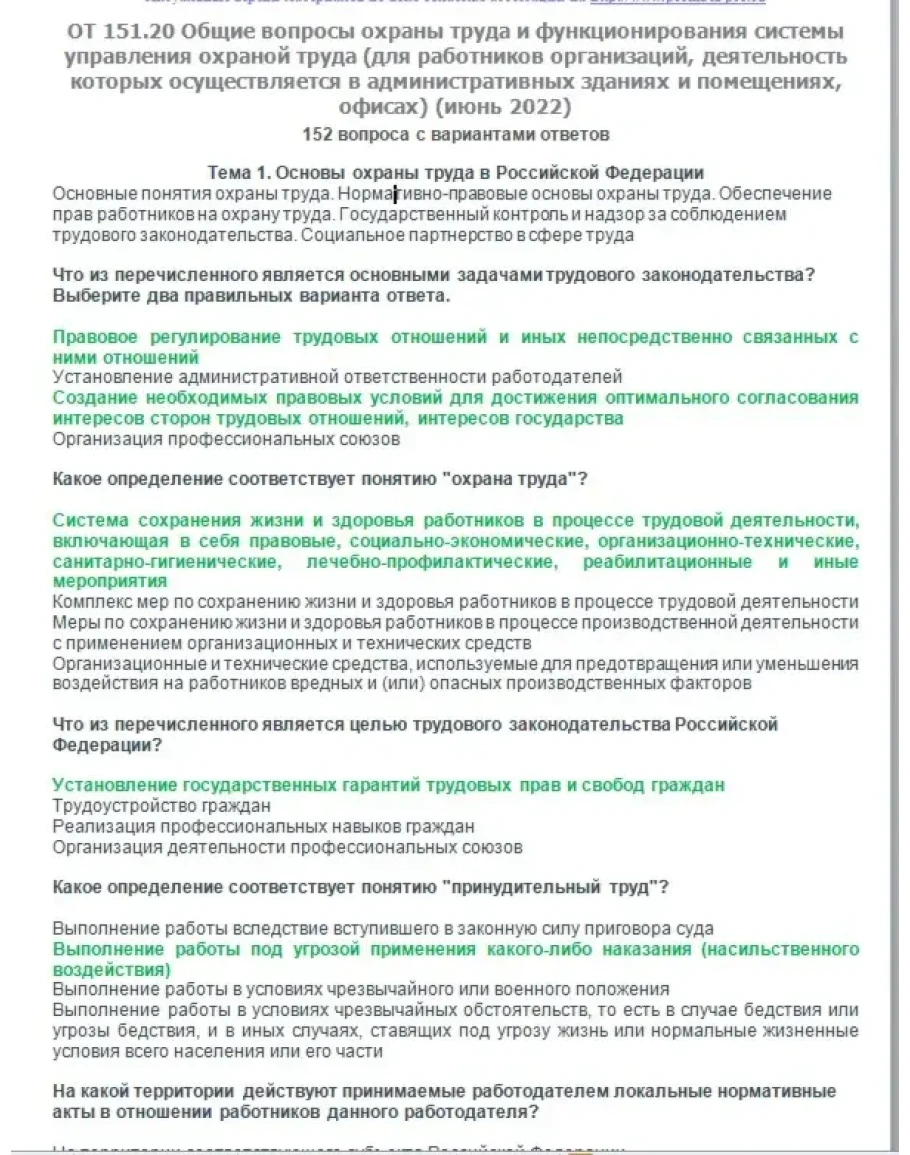 Вопросы с ответами к курсам ОКС-Олимп ОТ 151.20 (август 2022) Общие вопросы охраны труда и функционирования системы управления ОТ (для работников организаций, деятельность которых осуществляется в административных зданиях и помещениях, офисах)
