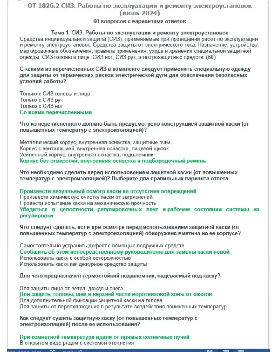 Вопросы с ответами к курсам ОКС-Олимп ОТ 1826.2 (июль 2024) СИЗ. Работы по эксплуатации и ремонту электроустановок