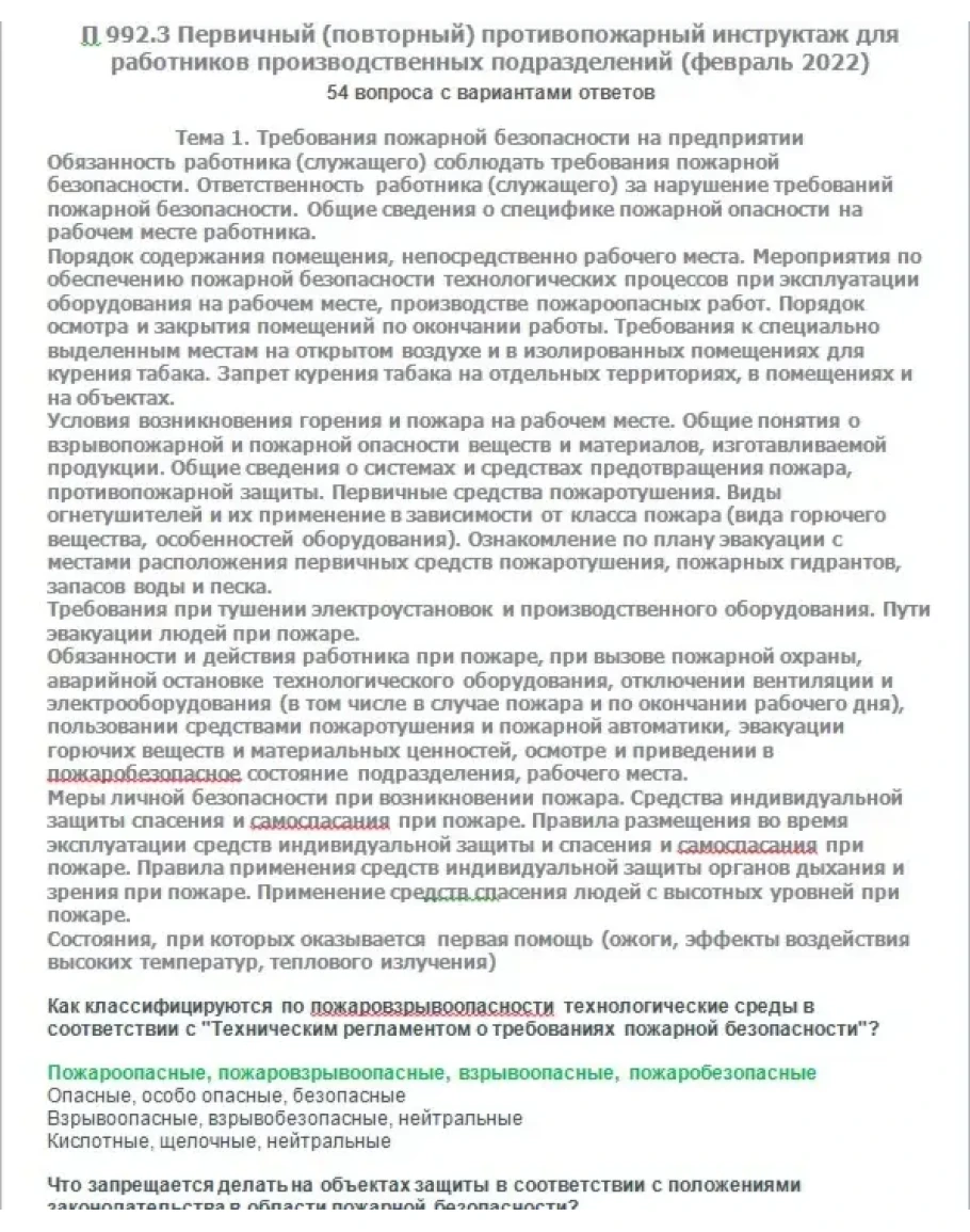 Вопросы с ответами к курсам ОКС-Олимп П 992.3 (февраль 2022) Первичный (повторный) противопожарный инструктаж для работников производственных подразделений