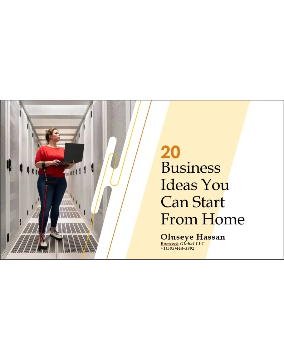 Unlock your entrepreneurial potential with "20 Business Ideas You Can Start From Home"—your essential guide to launching a successful business without leaving your doorstep. Whether you're looking to supplement your income or build a thriving full-time enterprise, this comprehensive resource offers a diverse range of business ideas that require minimal investment and maximum flexibility.