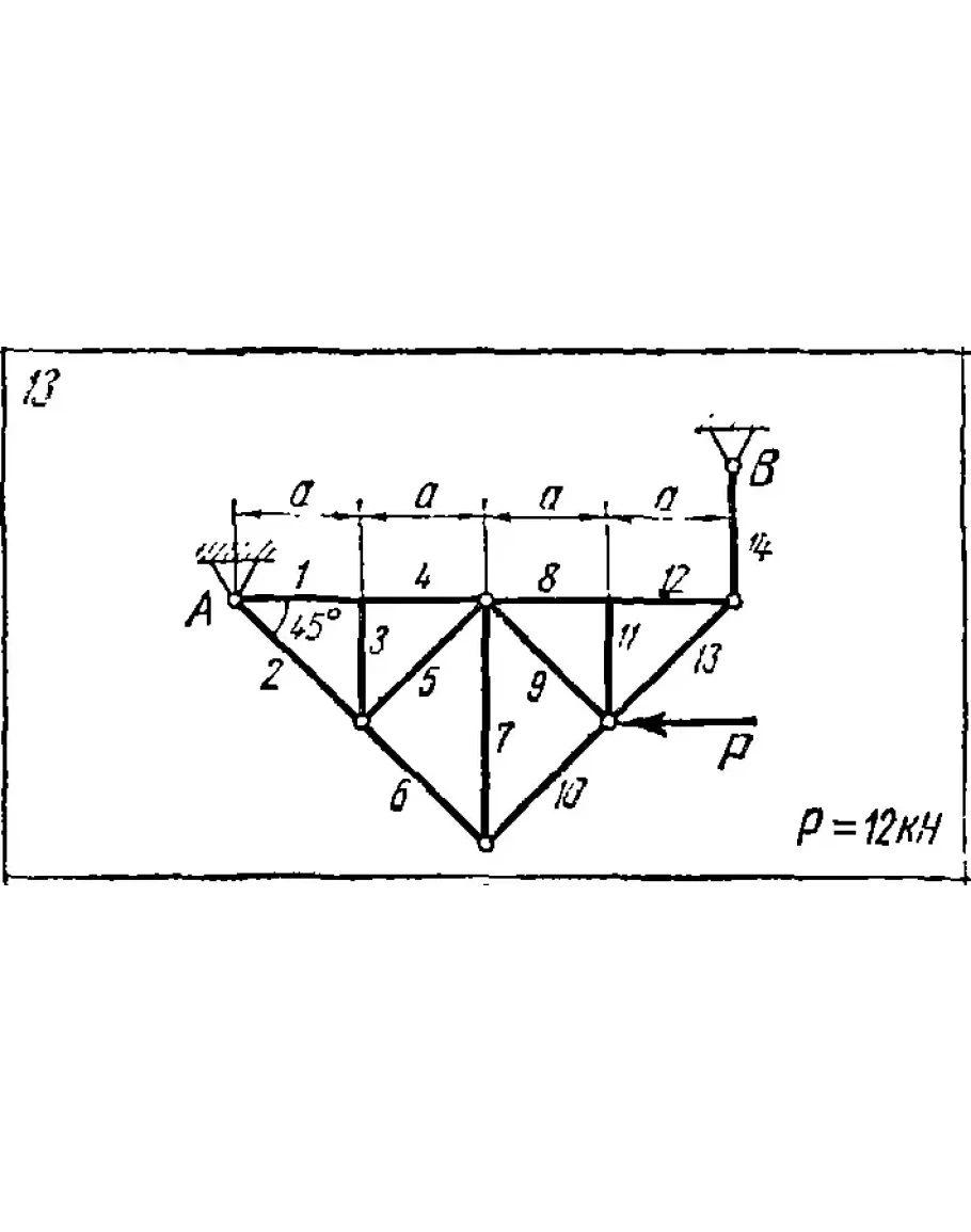 Решение задачи С1 вариант 13 из решебника по теоретической механике Яблонский А.А. 1978г, на тему: Определение реакций опор и усилий в стержнях плоской фермы (стр. 5).