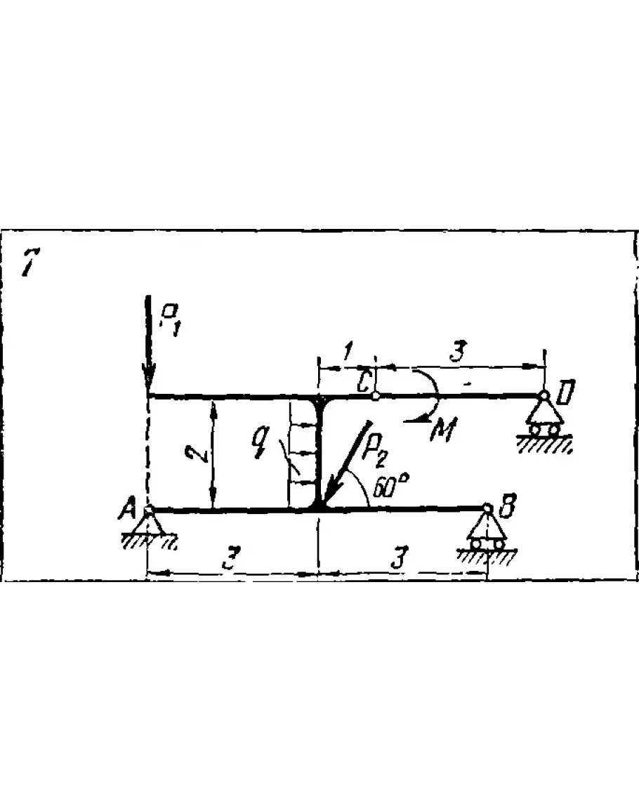 Решение задачи С5 вариант 7 из решебника по теоретической механике Яблонский А.А. 1978 г., на тему: С5 Определение реакций опор составной конструкции (система двух тел) (стр. 29 задачника)..