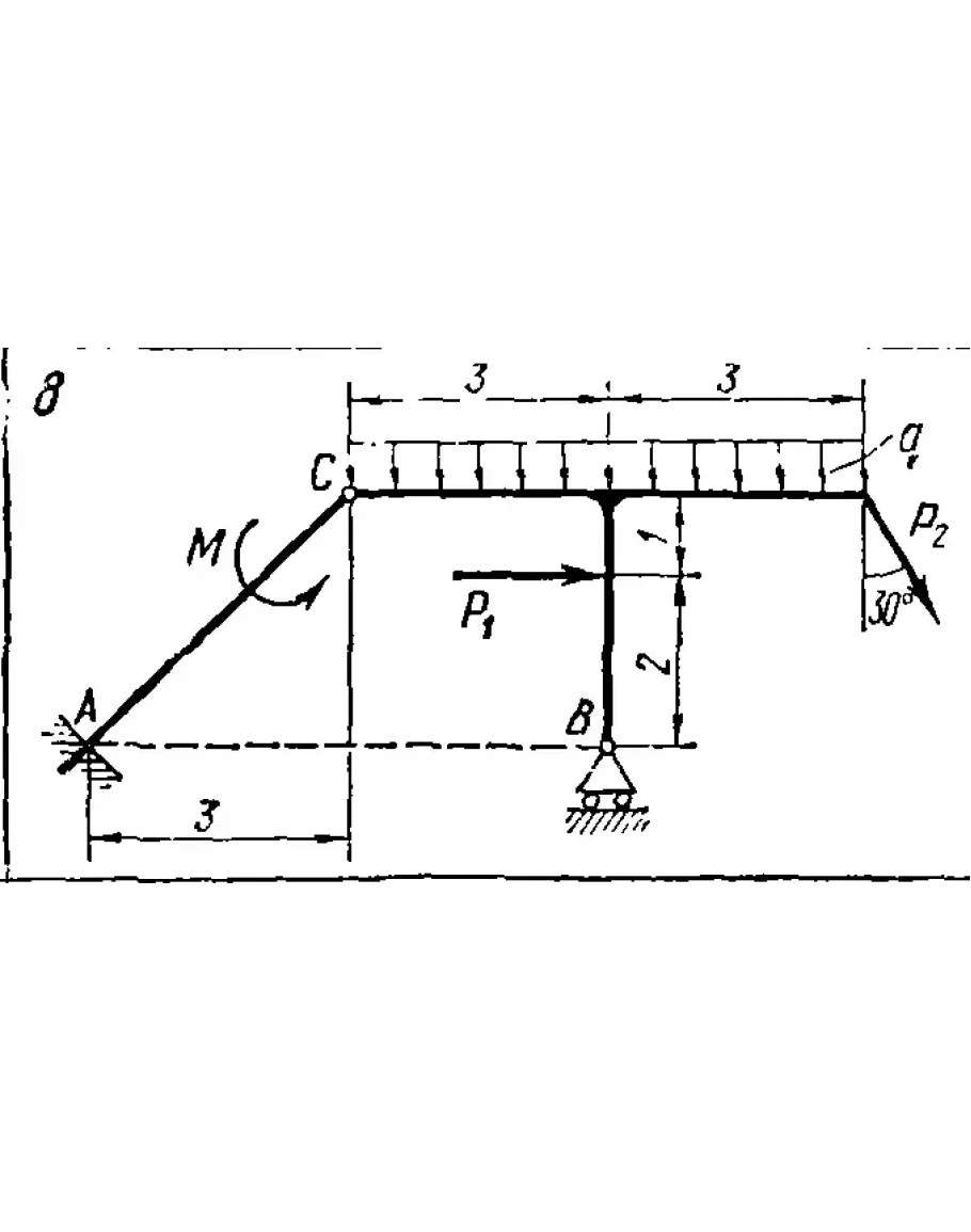 Решение задачи С5 вариант 8 из решебника по теоретической механике Яблонский А.А. 1978 г., на тему: С5 Определение реакций опор составной конструкции (система двух тел) (стр. 29 задачника)..