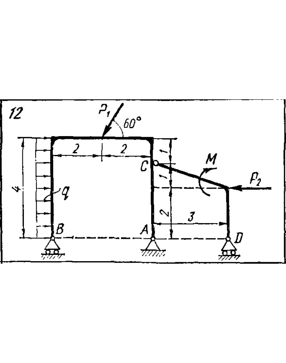 Решение задачи С5 вариант 12 из решебника по теоретической механике Яблонский А.А. 1978 г., на тему: С5 Определение реакций опор составной конструкции (система двух тел) (стр. 29 задачника)..