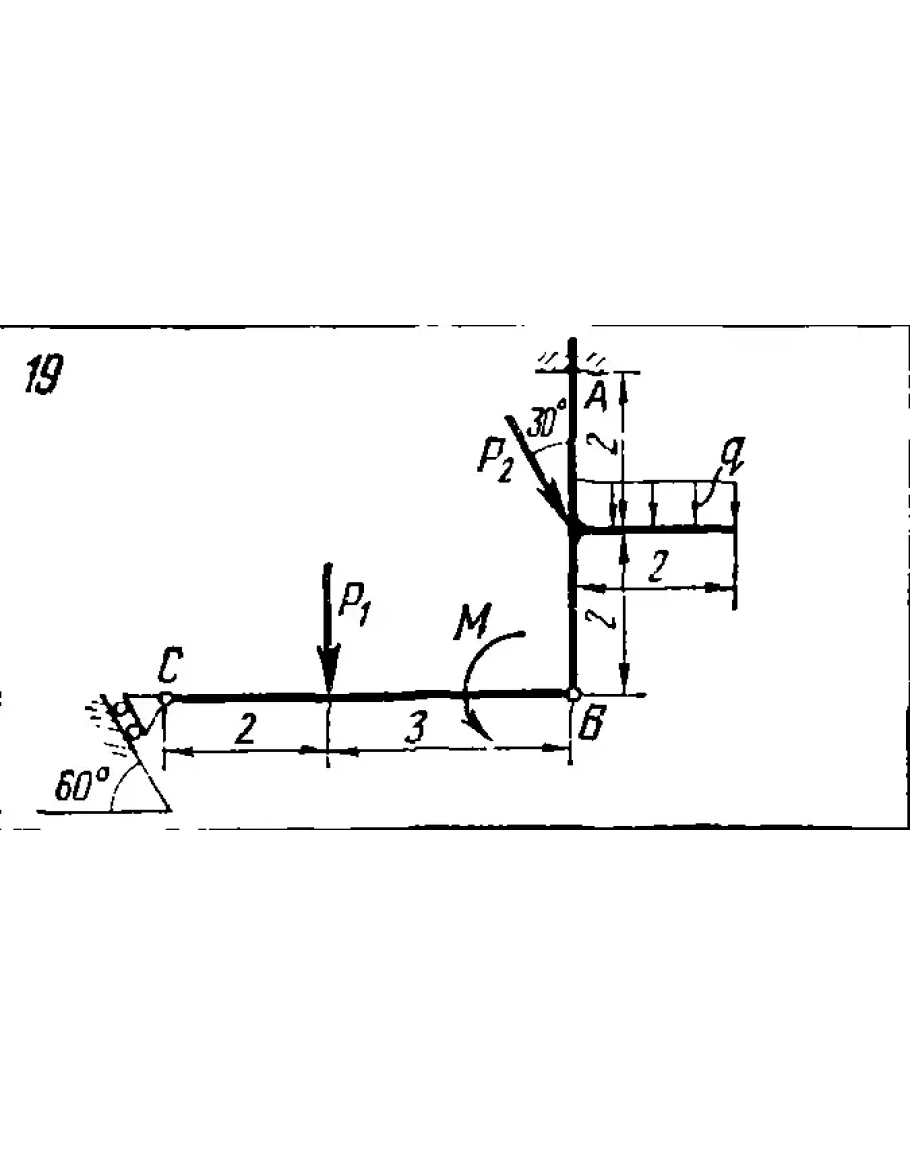 Решение задачи С5 вариант 19 из решебника по теоретической механике Яблонский А.А. 1978 г., на тему: С5 Определение реакций опор составной конструкции (система двух тел) (стр. 29 задачника)..